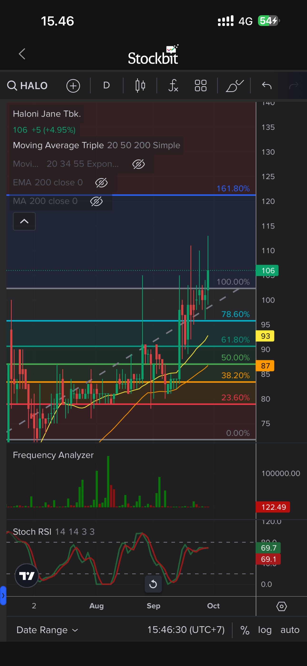Saham HALO sedang dalam tren kenaikan yang kuat. Saat ini, harganya berada di level 106, yang berhasil menembus level-level Fibonacci Retracement sebelumnya. Level-level kunci yang berhasil dilewati adalah 78.60% (93), 61.80% (90), dan 50.00% (87). Hal ini menunjukkan momentum bullish yang signifikan.