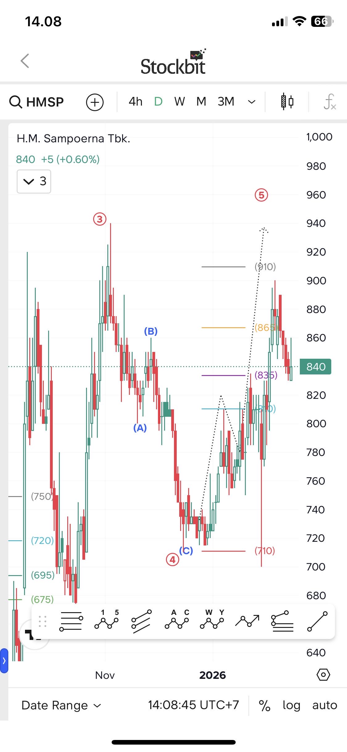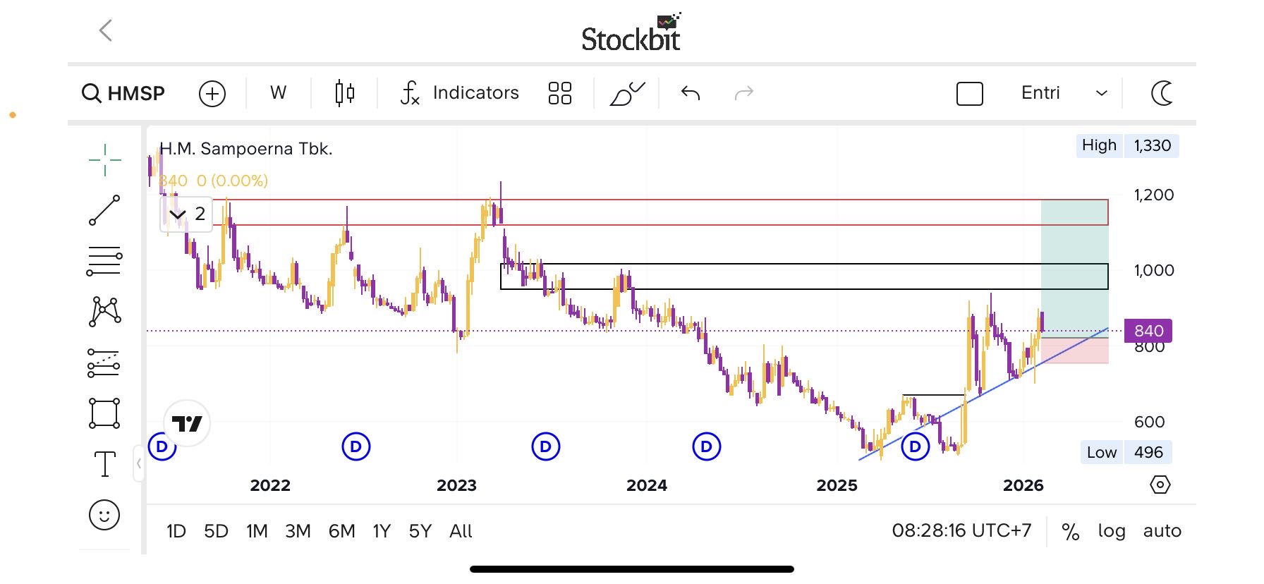 Alasan: Harga masih konsolidasi di atas area support kuat, struktur swing HMSP mulai membaik Boss.