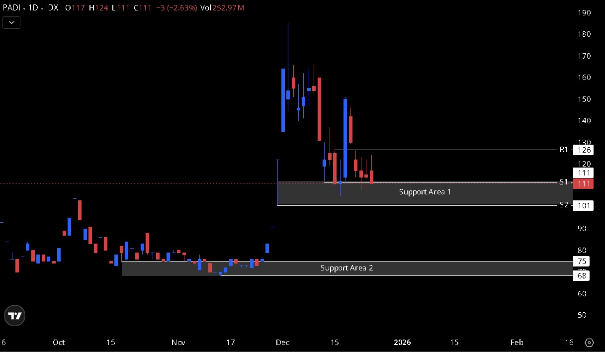 • Berada di area akumulasi dengan potensi lanjutan teknikal
