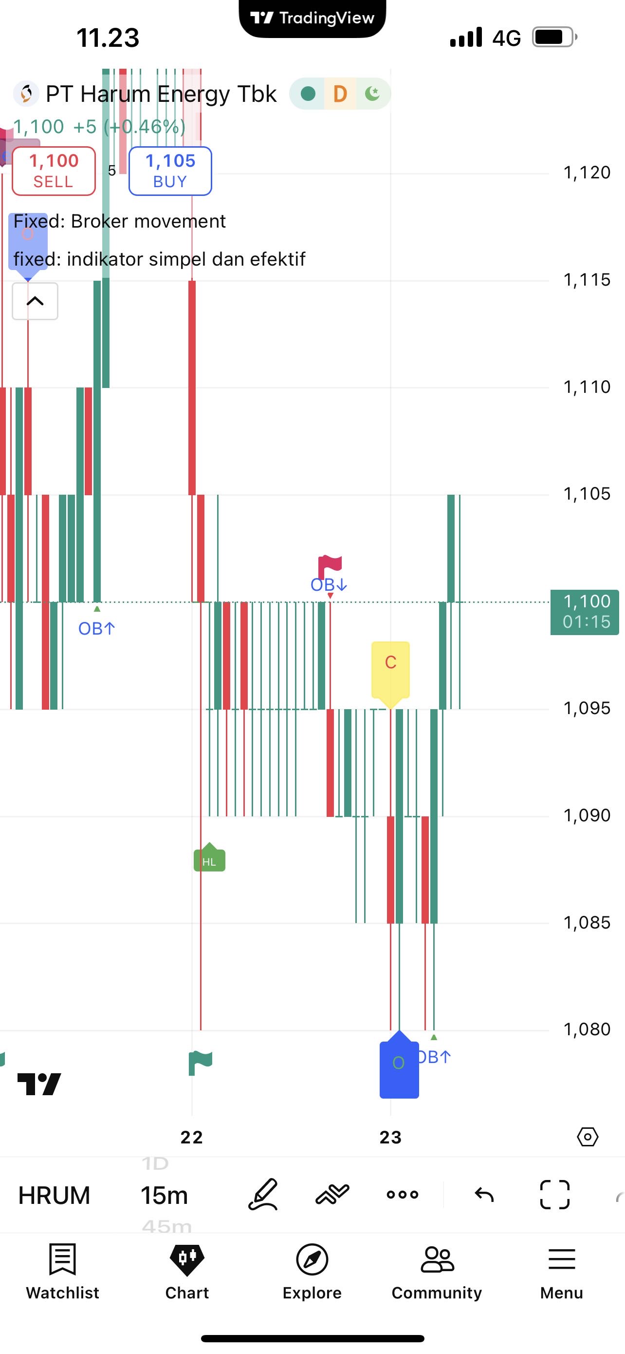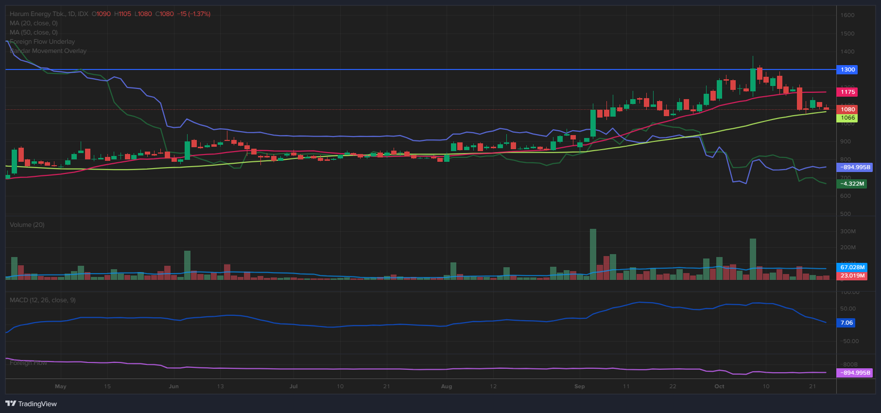 $HRUM Minggu ini turun dgn manis, tapi tentunya kita gak bisa berharap saham naik terus dan momentumnya positif terus, tanpa ada break. Koreksi itu sehat asal gak sampai membalikkan tren. Kalau dari price action sebenarnya ini termasuk koreksi sehat, ngetes level 1050 dan konsolidasi di sana. Price action Minggu depan akan jadi lebih menarik, worst case scenario koreksinya belum selesai dan kembali ke 960, best case tentu langsung mantul dan retest 1300 lagi, tapi menurut saya masih belum saatnya. Tebakan saya mungkin konsolidasi membosankan di sekitar 1050-1135, atau koreksi lagi.Non financial advice saya bukan analis profesional dan cuma sekedar tukang tarik garis di chart.
