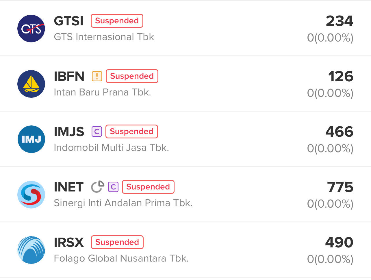 Jakarta, CNBC Indonesia - Bursa Efek Indonesia (BEI) menghentikan sementara perdagangan (suspensi) saham 5 perusahaan tercatat karena telah terjadinya peningkatan harga kumulatif yang signifikan.