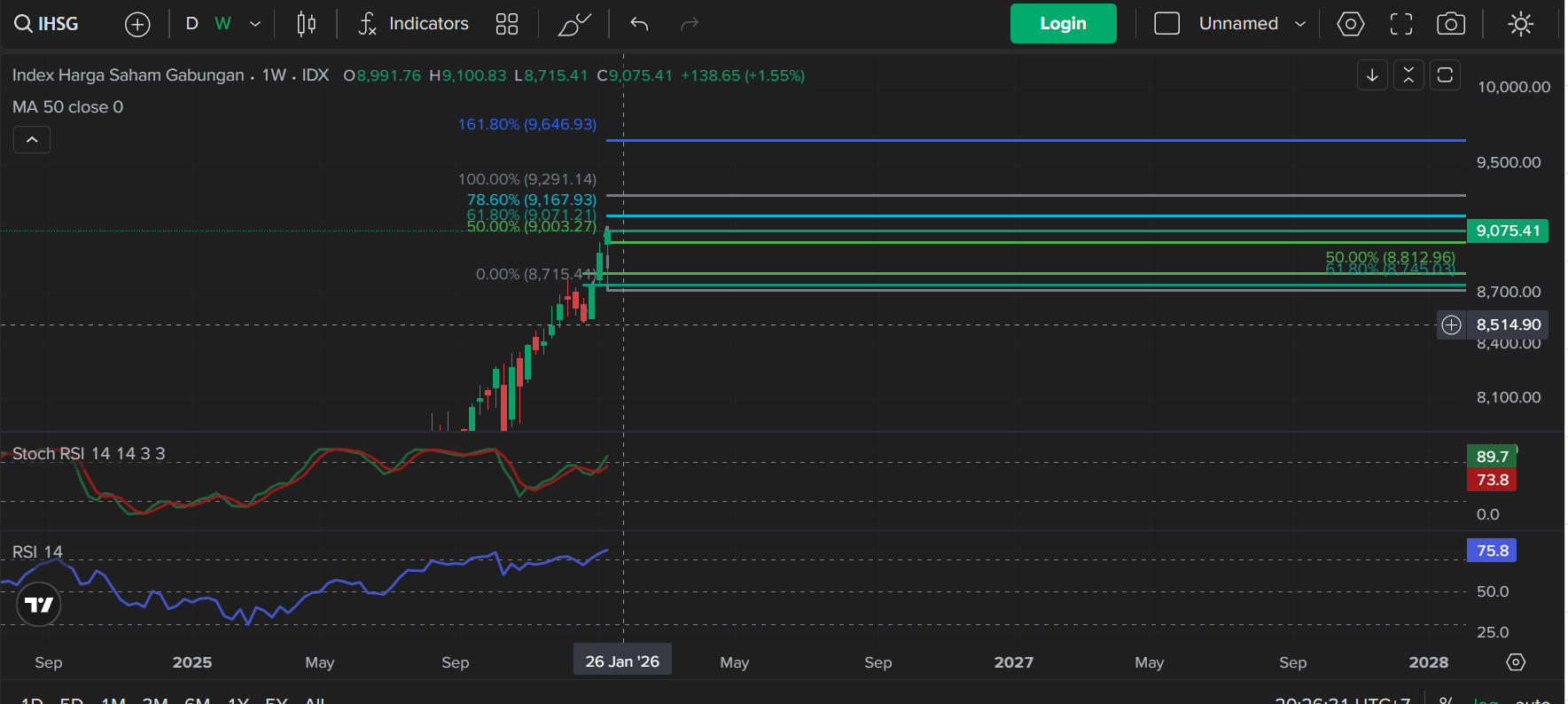 IDXChannel - Indeks Harga Saham Gabungan (IHSG) diprediksi mengalami koreksi hingga 8.970 pada pekan depan, Senin (19/1/2026). Namun, juga bisa dicermati area penguatannya.