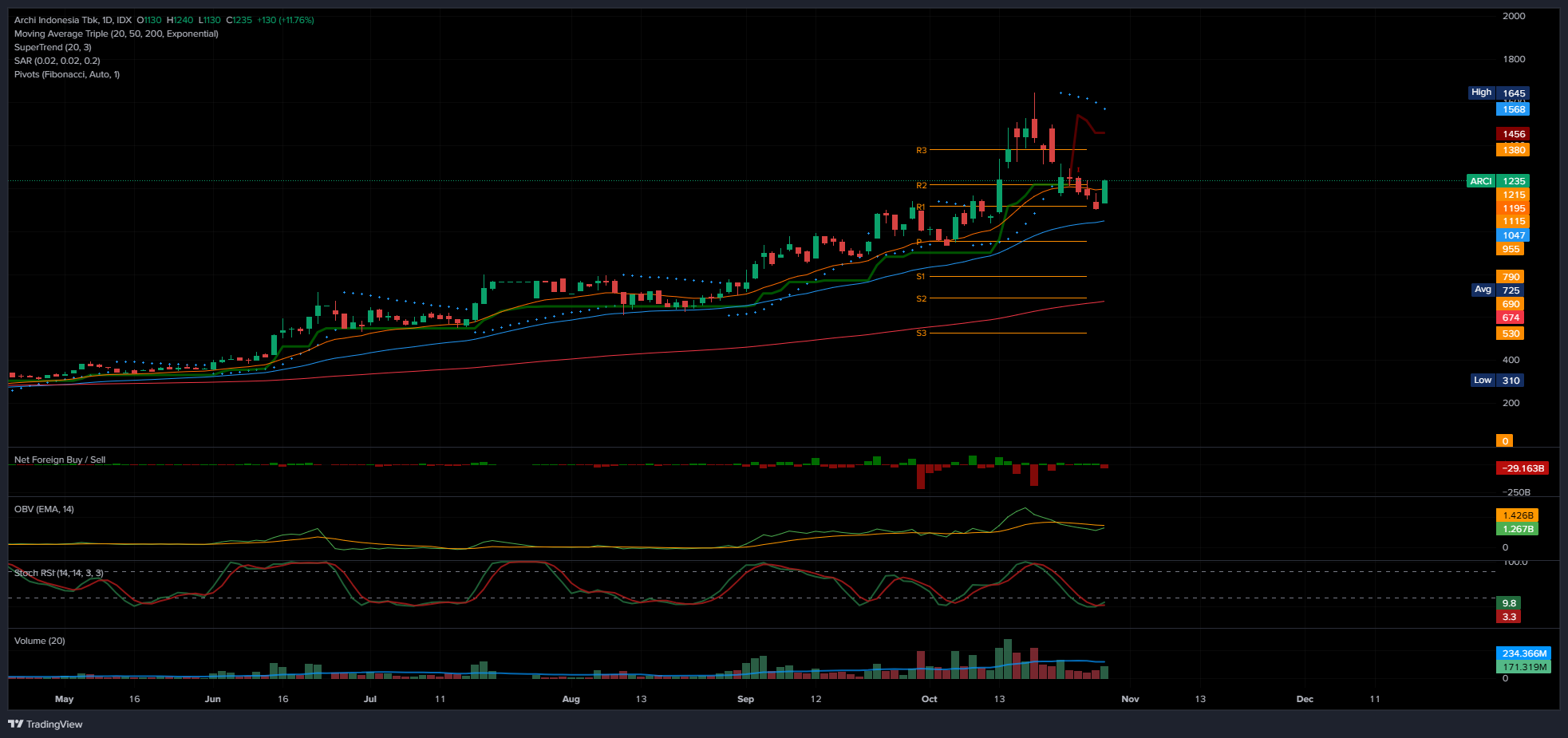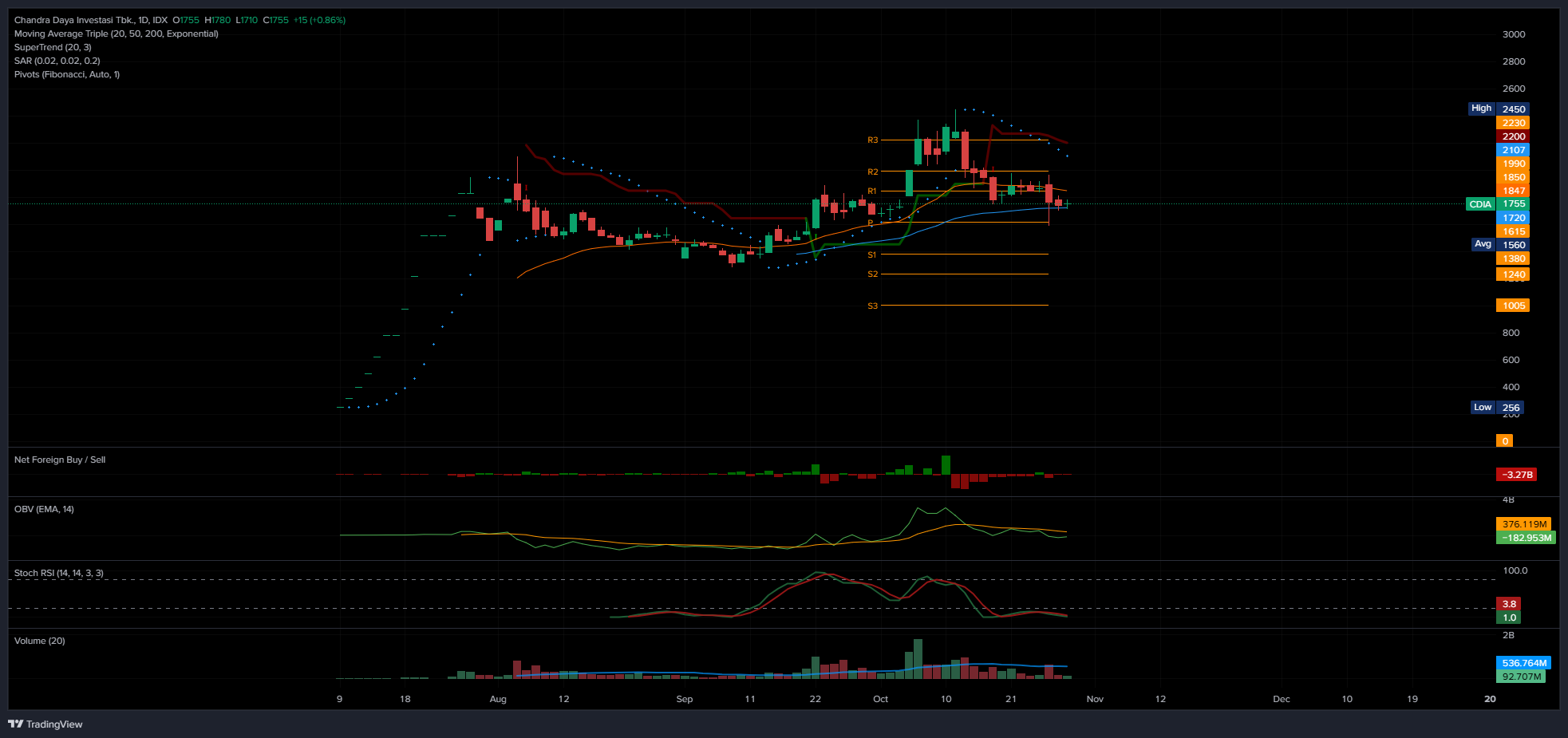 - Koreksi ringan ke EMA20 (sekitar 1300–1350) masih sehat dan menjadi area ideal untuk akumulasi.