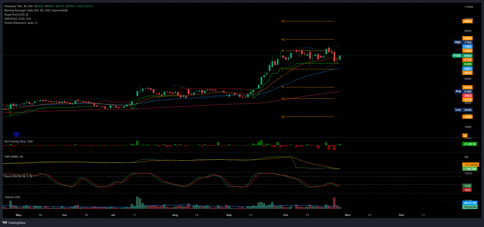 - PTRO sedang membentuk pola higher low di atas EMA50 — indikasi bahwa koreksi mungkin mulai berakhir.