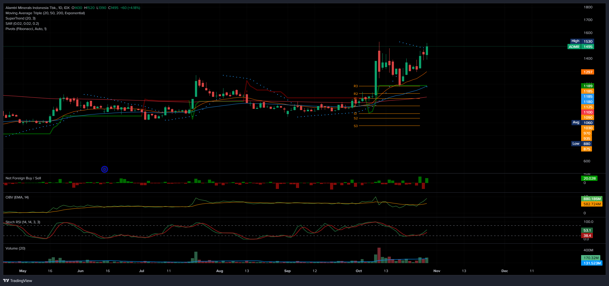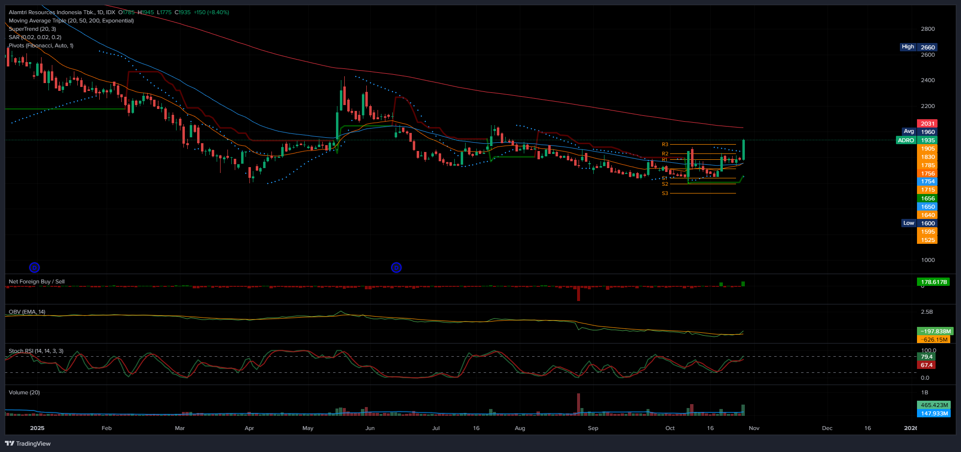 📌ADMR berada dalam fase bullish kuat setelah berhasil menembus area konsolidasi 1200–1300. Struktur harga, indikator momentum, serta aliran dana asing semuanya mendukung potensi kelanjutan uptrend menuju area 1600–1800.