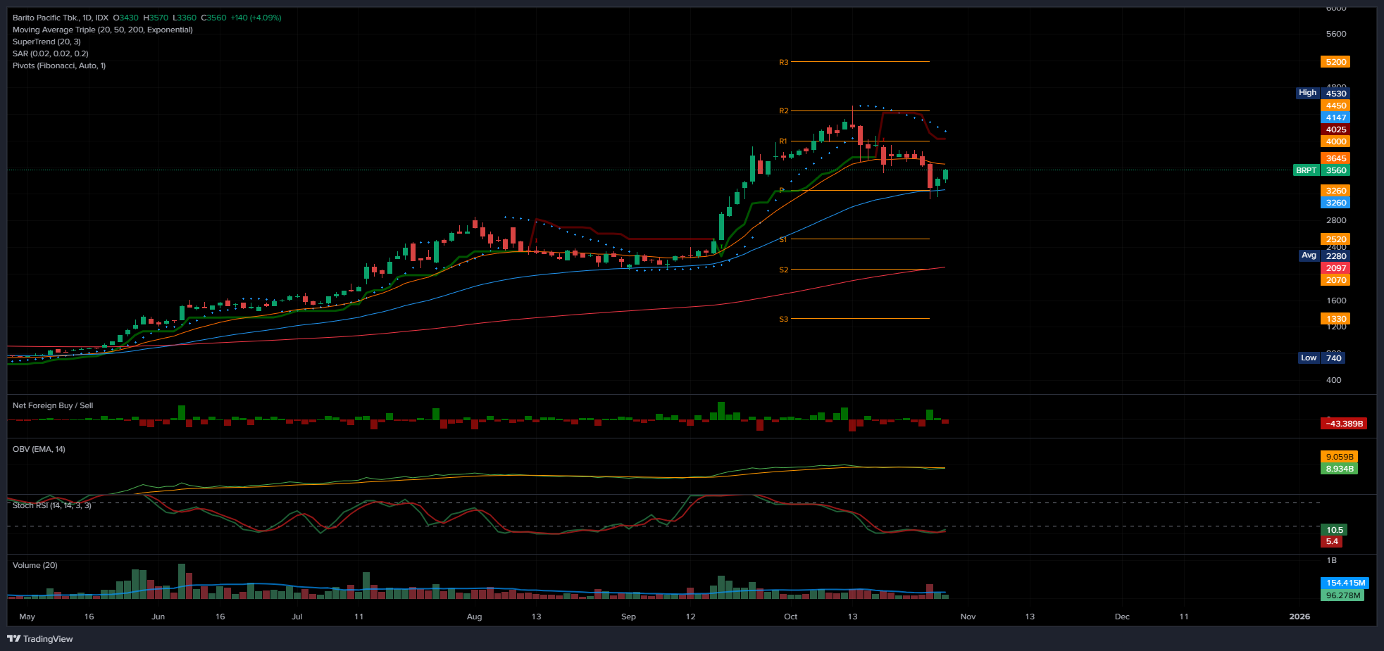📌BRPT masih dalam tren bullish jangka menengah-panjang, namun baru saja melewati fase koreksi wajar. Saat ini harga mencoba rebound dari support EMA50 (3260).