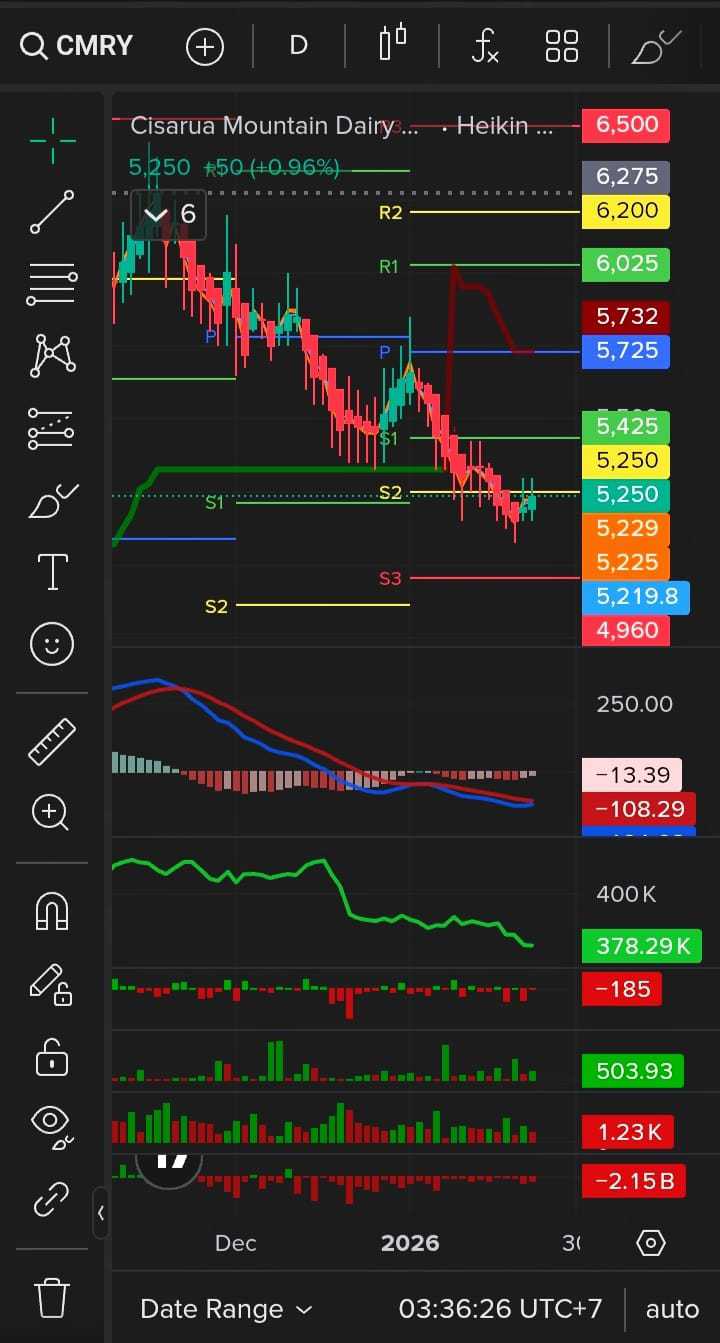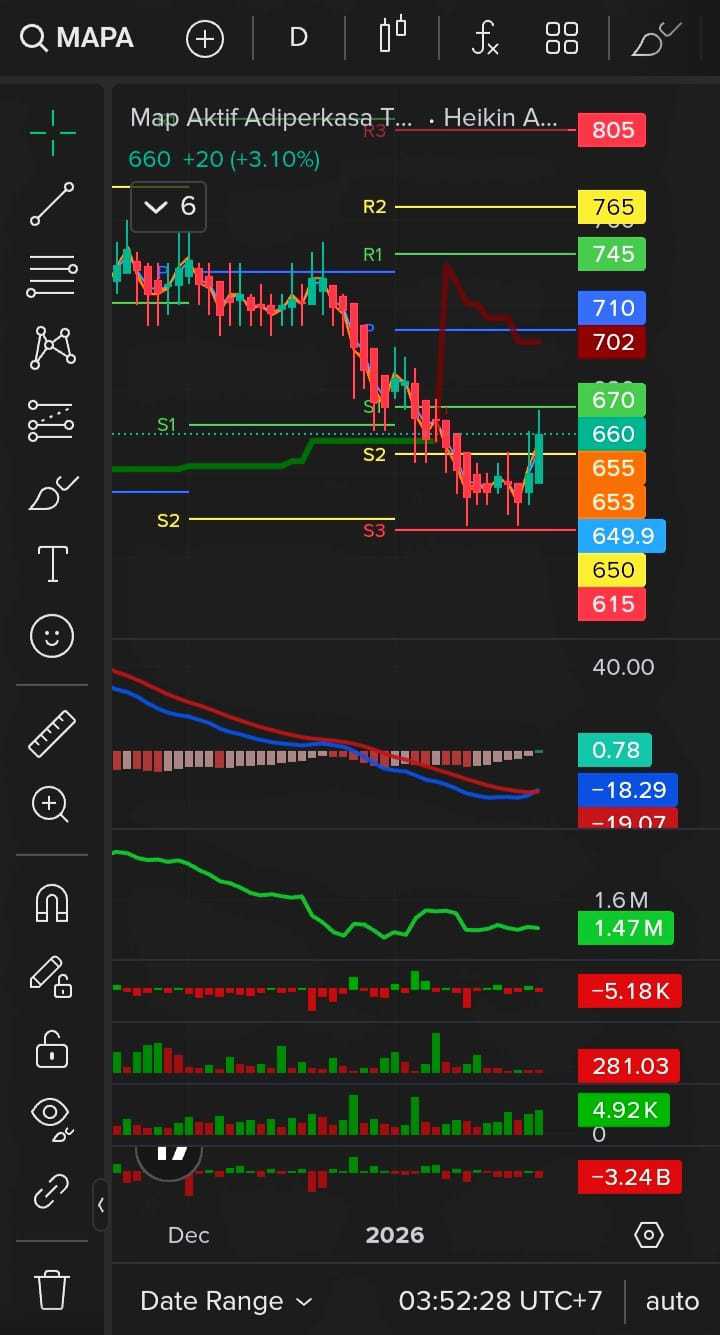 AYAM sebelumnya mengalami kenaikan kuat (uptrend) dari area 200-300 hingga 450+. Saat ini harga bergerak sideways di area atas, menandakan fase konsolidasi setelah reli. Struktur masih tergolong sehat selama harga mampu bertahan di atas area support, meski momentum jangka pendek mulai melambat dan rawan profit taking ringan.