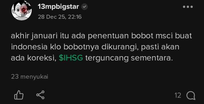 "... MSCI sedang menimbang ulang cara menghitung free float saham Indonesia. Itu bukan perubahan kosmetik. Kalau free float dihitung lebih ketat / diperluas, bobot saham dalam indeks global bisa turun, yang berarti dana asing (pasif ETF tracker) bisa mengurangi alokasinya. Itu lah kenapa IHSG sempat turun akhir Januari karena kekhawatiran terhadap rencana ini"
