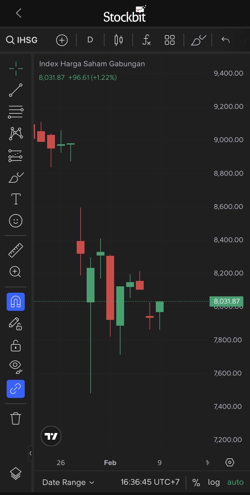 Jakarta, CNBC Indonesia - Indeks Harga Saham Gabungan (IHSG) lompat 96,61 poin atauย melesat 1,22% padaย akhir perdagangan hari ini, Senin (9/2/2026). Indeks berakhirย terapresiasi ke level 8,031,87.