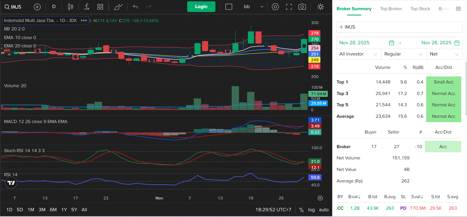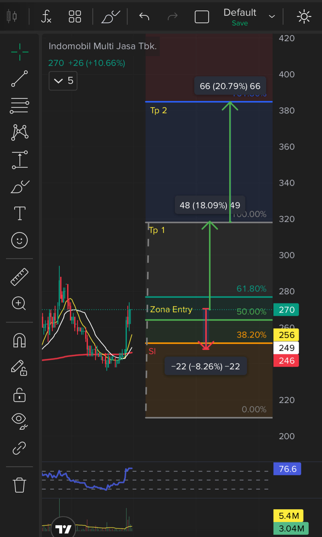$IMJS ditutup menguat +10.66% ke 270, membentuk candle bullish kuat dengan volume besar (71.9M), menandakan minat beli meningkat signifikan. Harga sudah kembali ke atas semua EMA (10/20/50) sehingga struktur kembali bullish setelah konsolidasi panjang.
