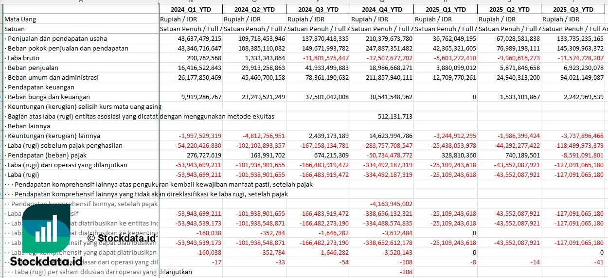 - PER: -1,41x | PBV: -0,48x (negatif, menandakan kerugian)