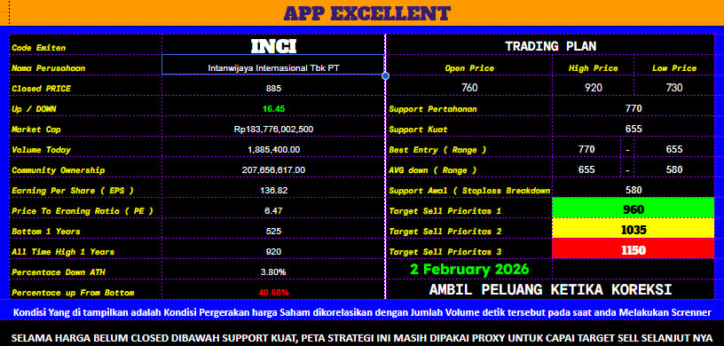 - Catatan : Harga berada di area gocap dengan volatilitas tinggi, struktur belum stabil dan rawan false move, dominan permainan jangka pendek.