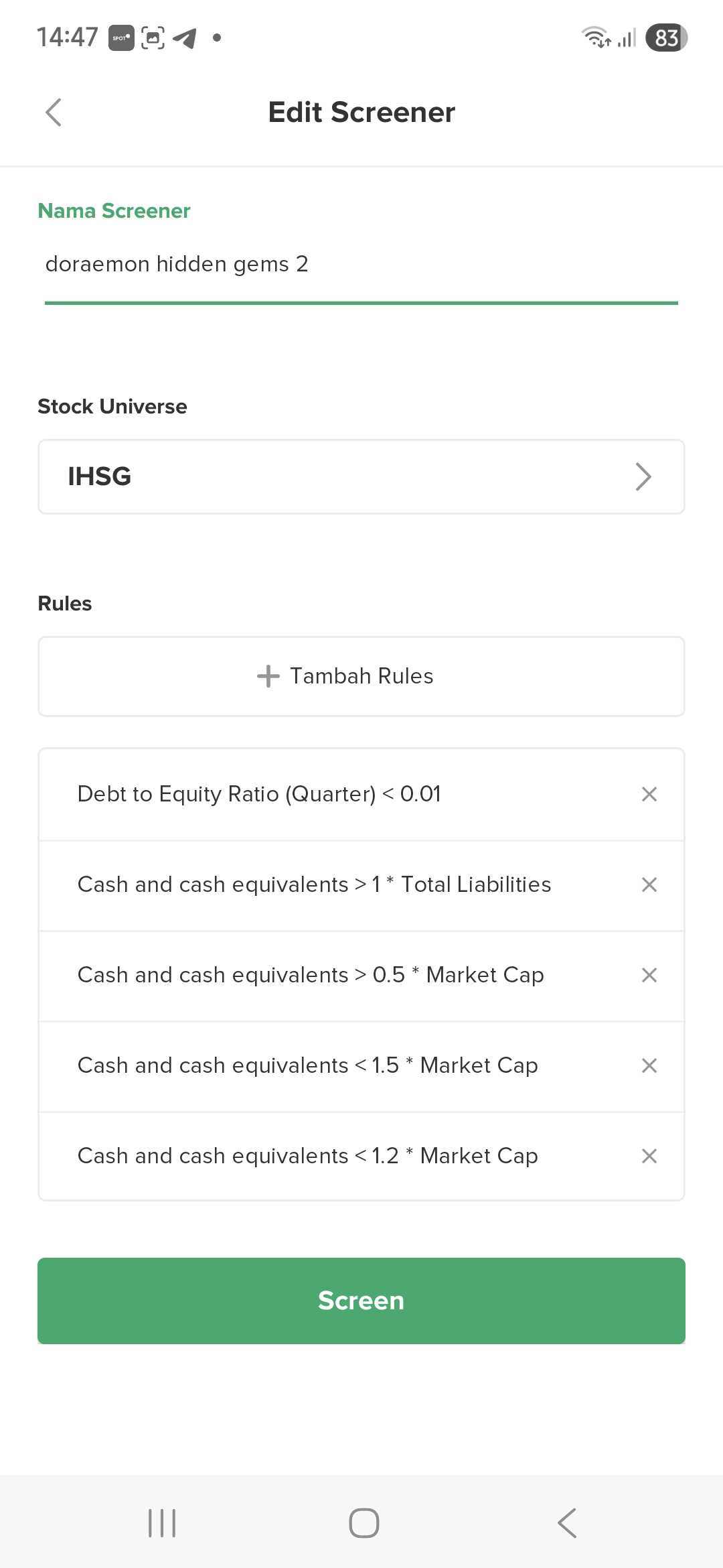 Ini settingan screener yang saya pakai.