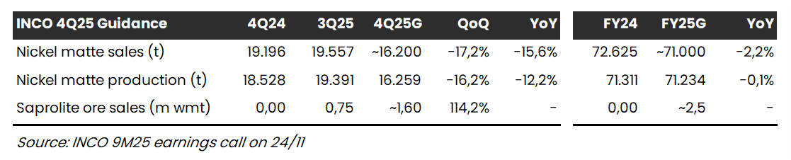 Manajemen Vale Indonesia ($INCO) dalam earnings call kinerja 3Q25 pada Senin (24/11) menyampaikan outlook kinerja 4Q25 dan guidance 2026. Berikut rinciannya: