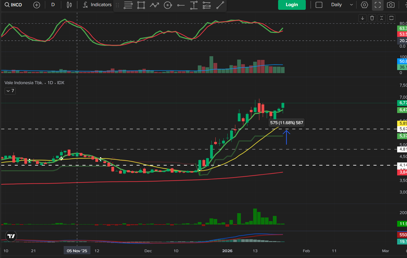 $INCO menunjukkan breakout kuat dari fase akumulasi di akhir Desember, didukung lonjakan signifikan volume (bandarmology: akumulasi besar oleh big player). Saat ini membentuk pola bullish continuation dengan higher high dan higher low. Harga bergerak di atas EMA 9 dan EMA 20 (trend jangka pendek dan menengah kuat naik). Tidak ada tanda distribusi besar, volume tetap sehat mendukung reli. Terjadi pullback sehat di tengah tren naik, dan saat ini harga kembali break ke atas. Candle terakhir menunjukkan bullish marubozu.