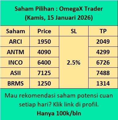 STOCKWATCH.ID (JAKARTA) – Indeks Harga Saham Gabungan (IHSG) pada perdagangan saham sesi I, Kamis (15/1/2026) ditutup di posisi 9.046,830, naik 14,245 poin atau menguat 0,16%. Ini dipicu oleh naiknya harga saham 351 emiten, sementara sebanyak 327 saham ditutup turun dan 122 saham tidak mengalami...