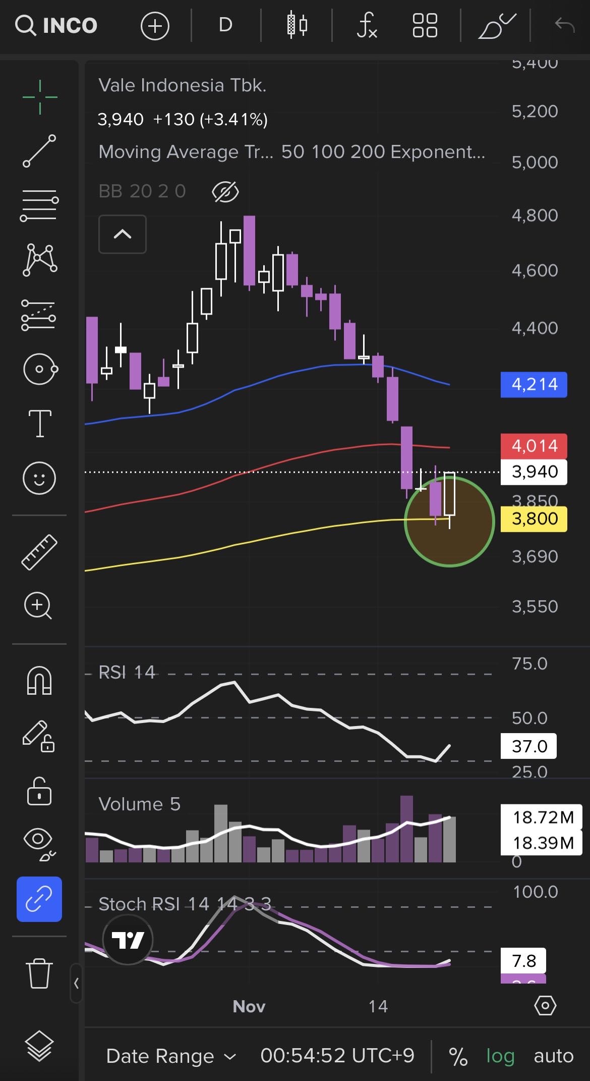 $INCO mengalami retest di MA 200 kemarin kemudian mengalami kenaikan. Jika MA 200 berhasil jebol maka akan menjadi bearish. Tapi menariknya semua indikator yang saya pakai yaitu MA, RSI, dan Volume menunjukkan support yang sangat bagus. Kenapa saya bilang bagus karena kemarin harga sempat berhenti di MA 200 kemudian harga naik, itu diimbangi dengan RSI yang cukup rendah dan kemarin menyentuh area overbought yaitu 29 dan volume juga mengalami kenaikan. Jadi kemungkinan terbesar harga akan kembali naik