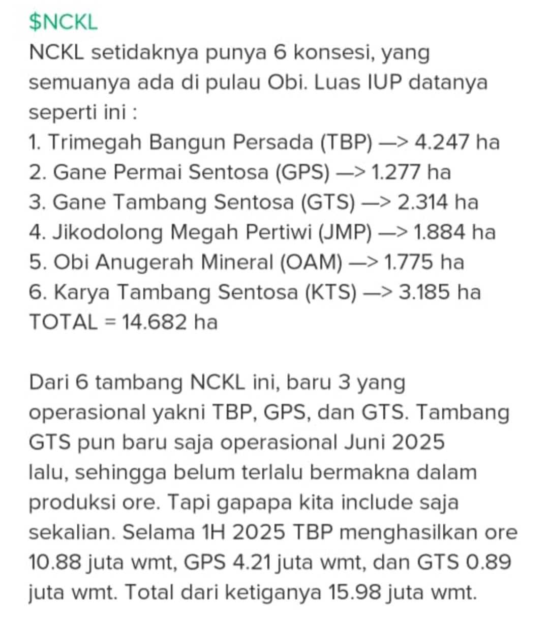 IUP $NCKL seluas 14.682 Hektar, dengan produksi ore di Semester 1 tahun 2025 = 15,98 Juta Ton, kalau dianualisasi = 30 Juta Ton