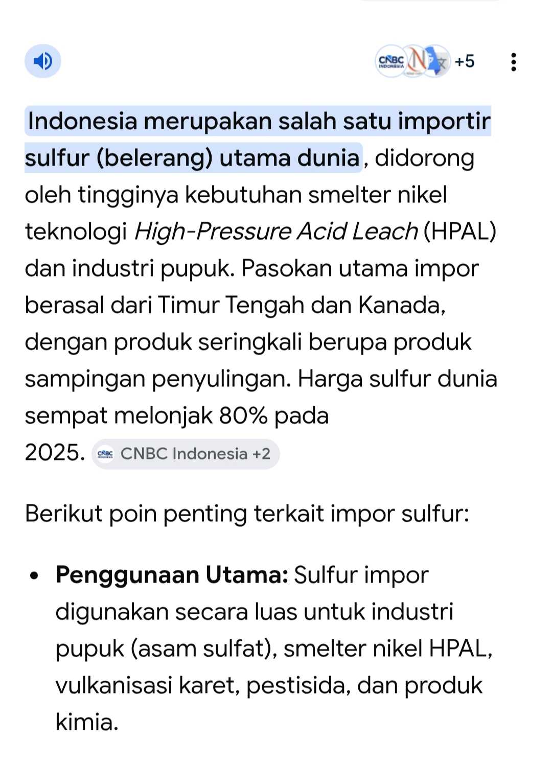 Smelter HPAL menyumbang defisit devisa via impor Sulfur dengan nominal sangat besar.