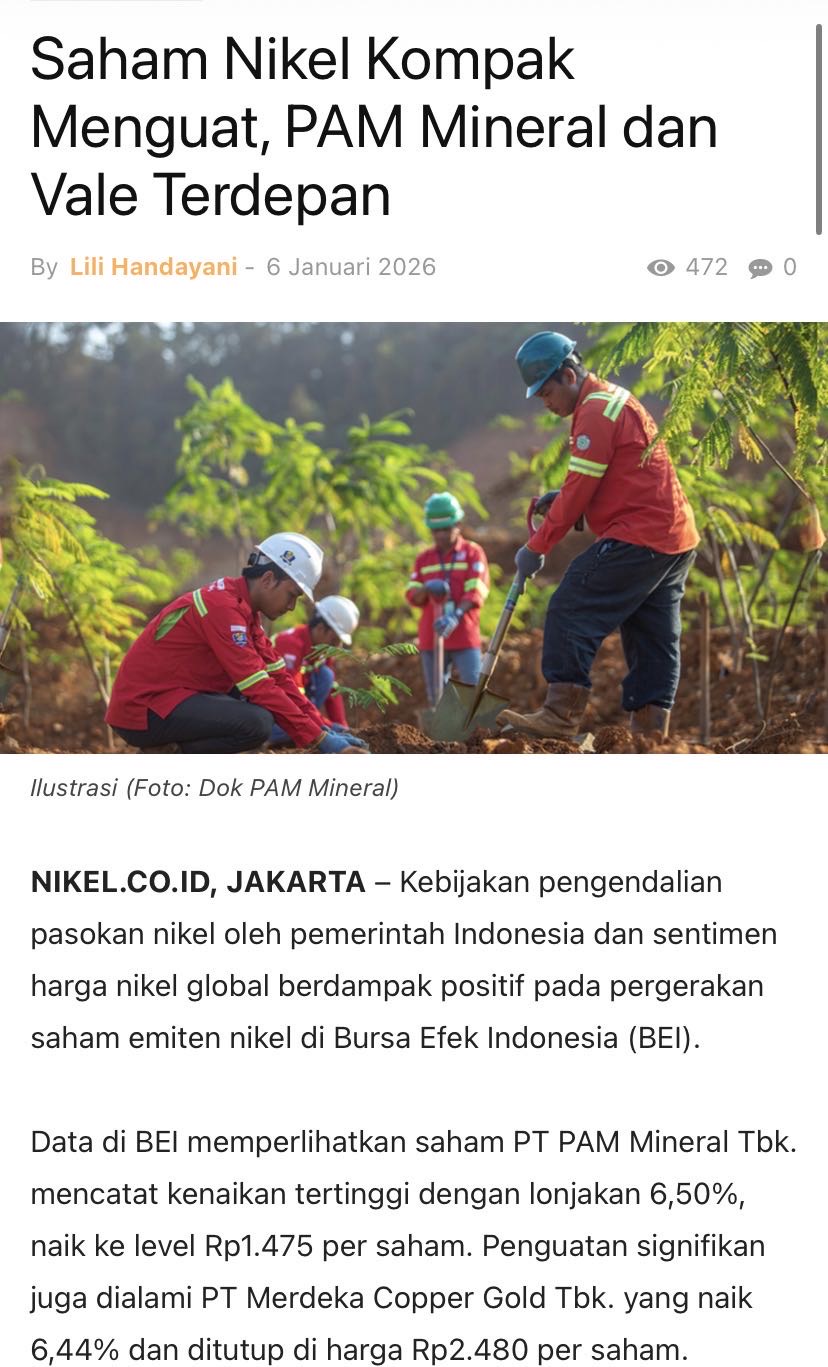 Pemerintah Indo hebat,dgn memiliki tambang nikel terbesar didunia membuat system bagus dari hulu ke hilir..sehingga harga nikel dunia awal 2026 ini naik & naik terus..