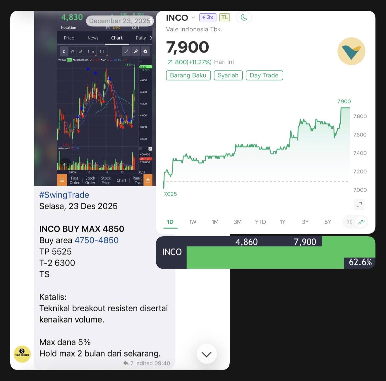 Naiknya INCO tentunya sangat menguntungkan bagi kami, karena membuat cuan kami semakin tebal. Alhamdulillah saat ini INCO sudah menghasilkan cuan +62%, yang artinya kurang setengah perjalanan lagi menuju cuan bagger +100%.