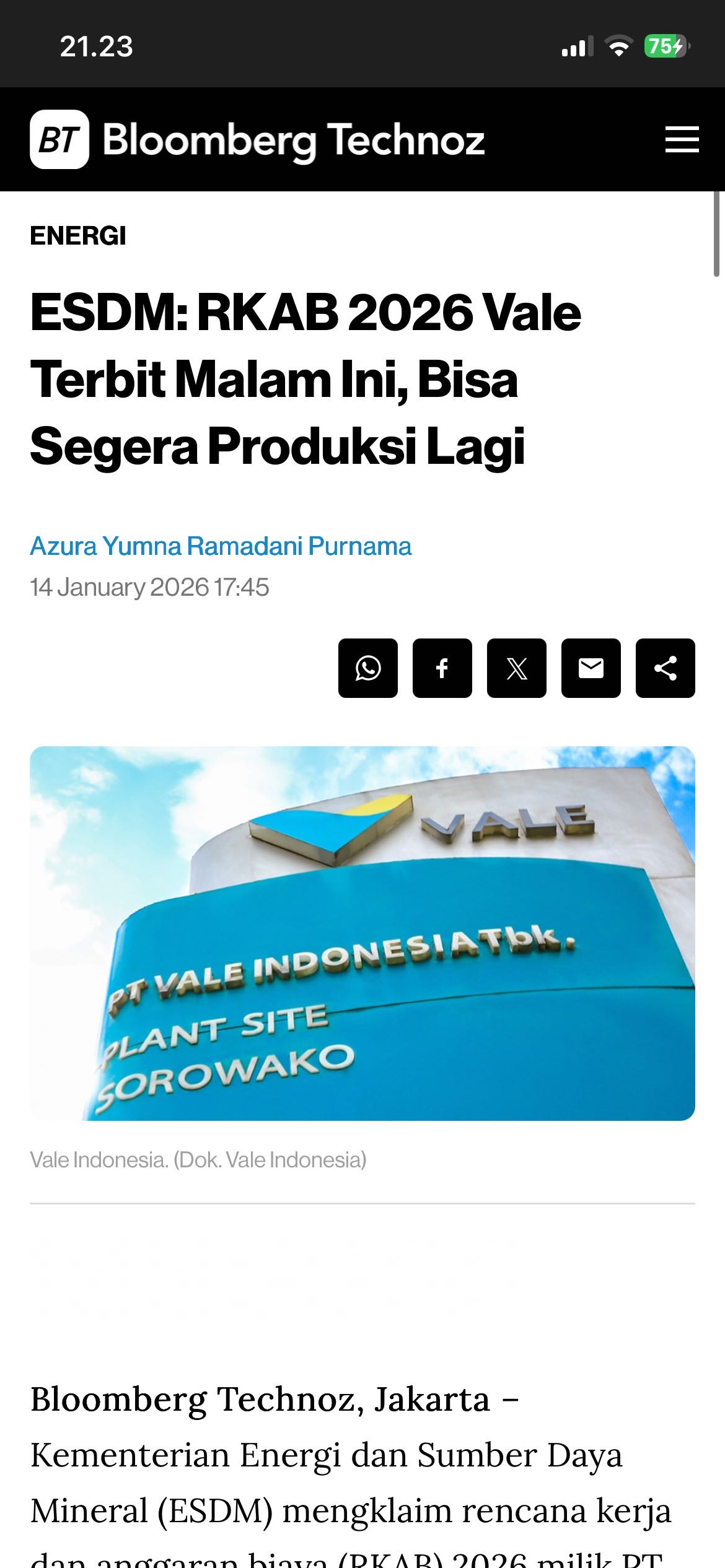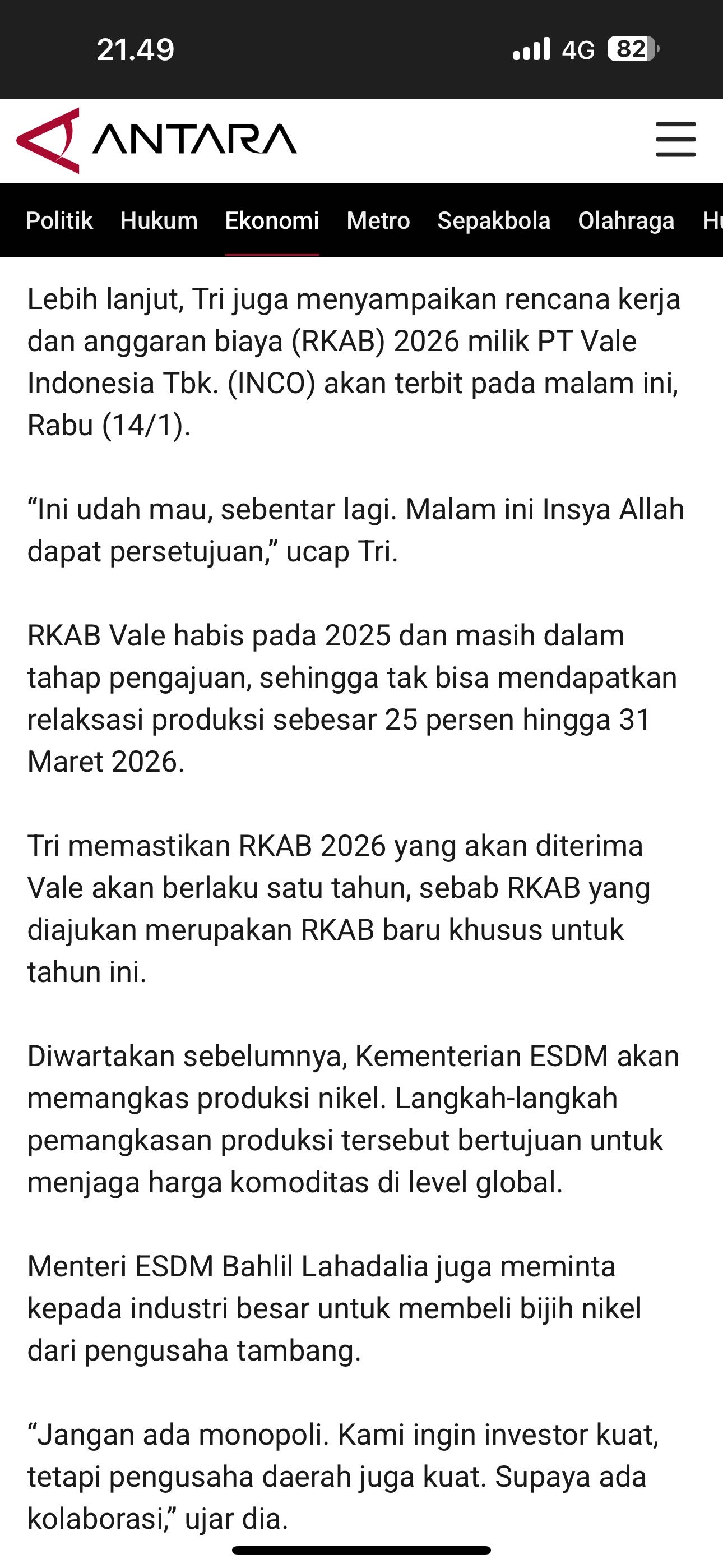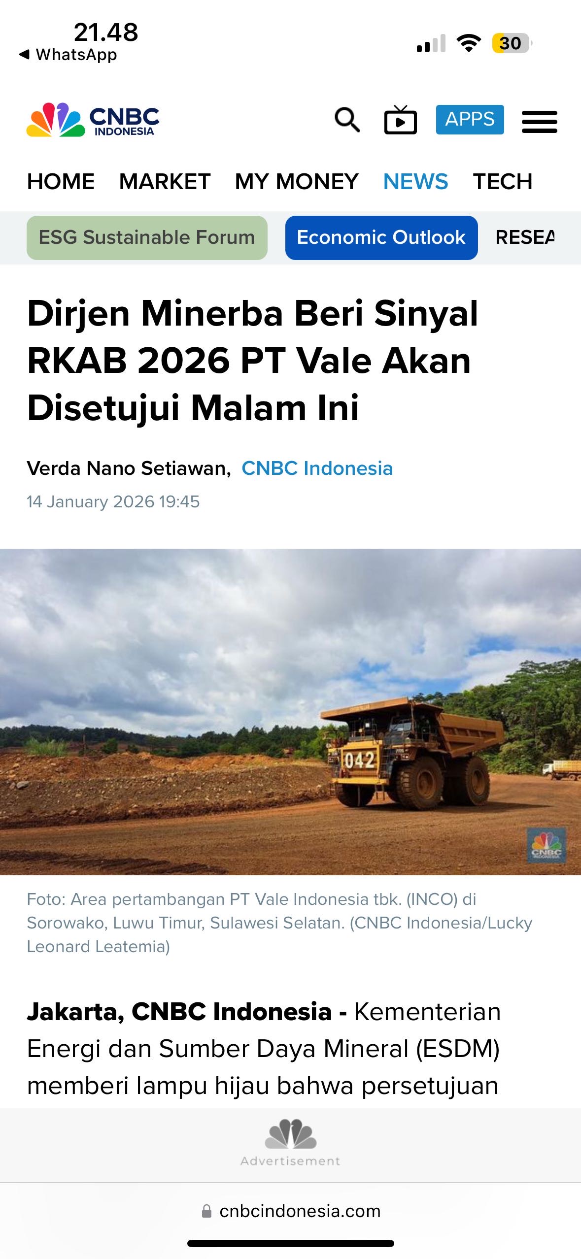 PT Vale Indonesia akhirnya mengantongi persetujuan rencana kerja dan anggaran biaya (RKAB) Tahun 2026 dari Kementerian Energi dan Sumber Daya Mineral (ESDM) pada Kamis (15/1).