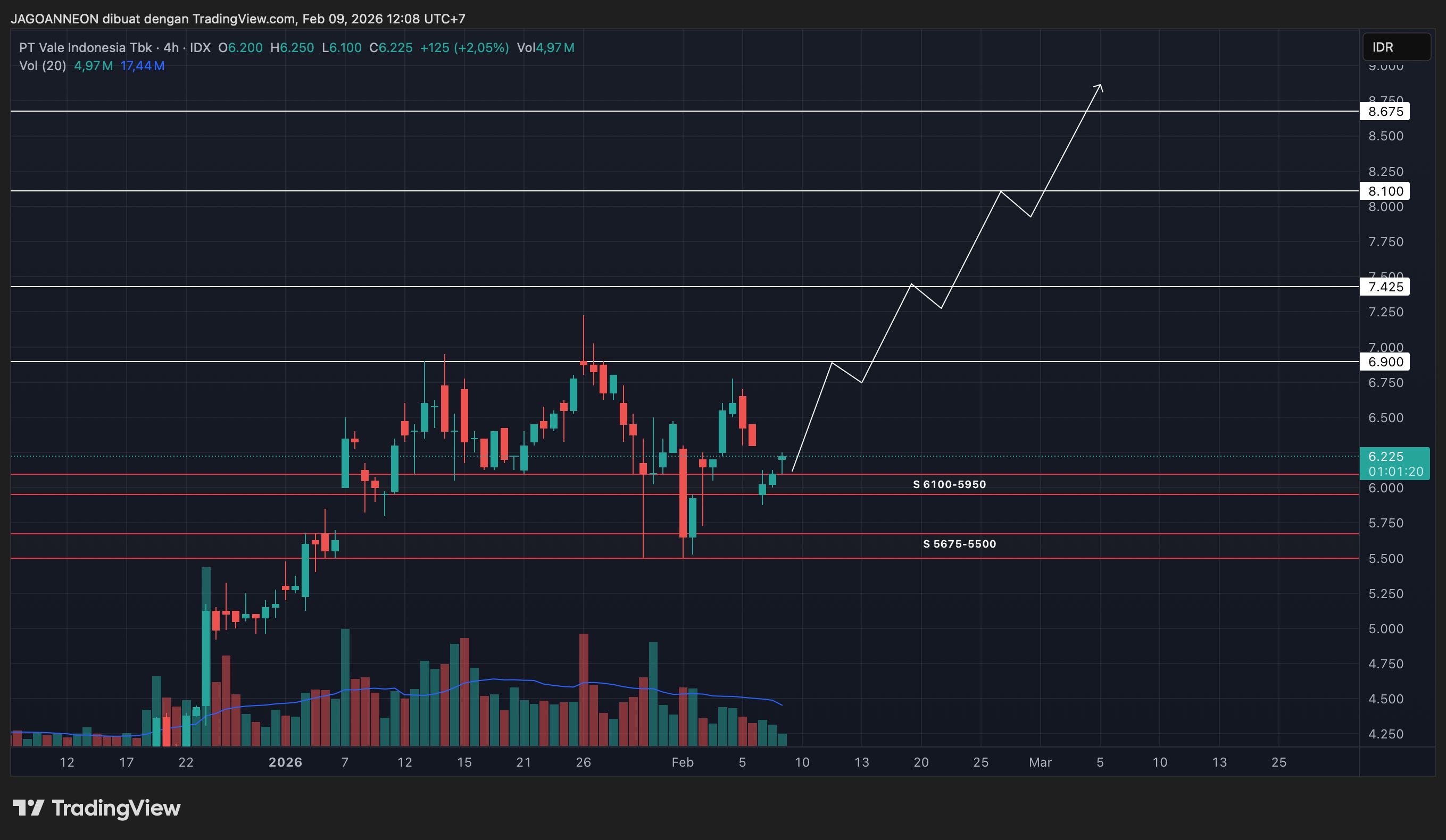 * **Posisi Harga:** Per Februari 2026, harga berada di kisaran **Rp6.100**. Tren saat ini cenderung *sideways* (datar).