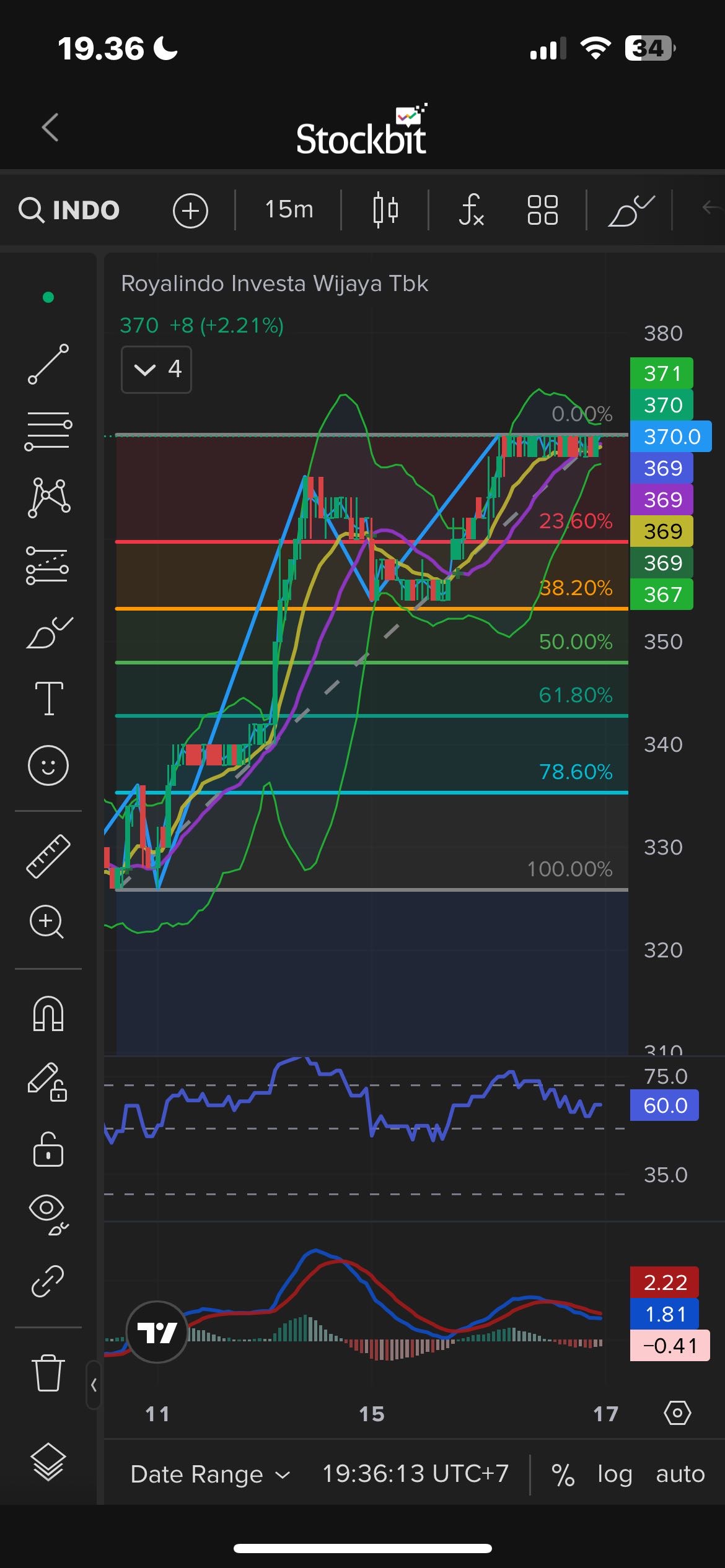 • Keadaan Pasar: Saham menunjukkan tren naik +2.21% dengan harga saat ini di Rp 370. Positif dengan breakout harga menuju resistance, namun RSI yang sudah mencapai 60 menunjukkan bahwa saham ini sudah cukup dekat dengan kondisi overbought, berpotensi mengalami retracement.