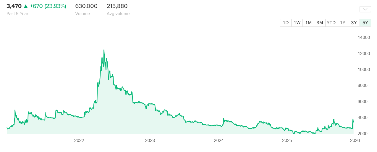SAHAM MELESAT 191% SEJAK NOVEMBER 2025: Dari 240 (November) ke peak 700+ (December-early January) = rally 191% dalam 2 bulan. Sekarang correction ke 555 = turun 20% dari ATH. Ini adalah parabolic rally typical speculative bubble. (IMPACT: WARNING - Valuation Stretched)
