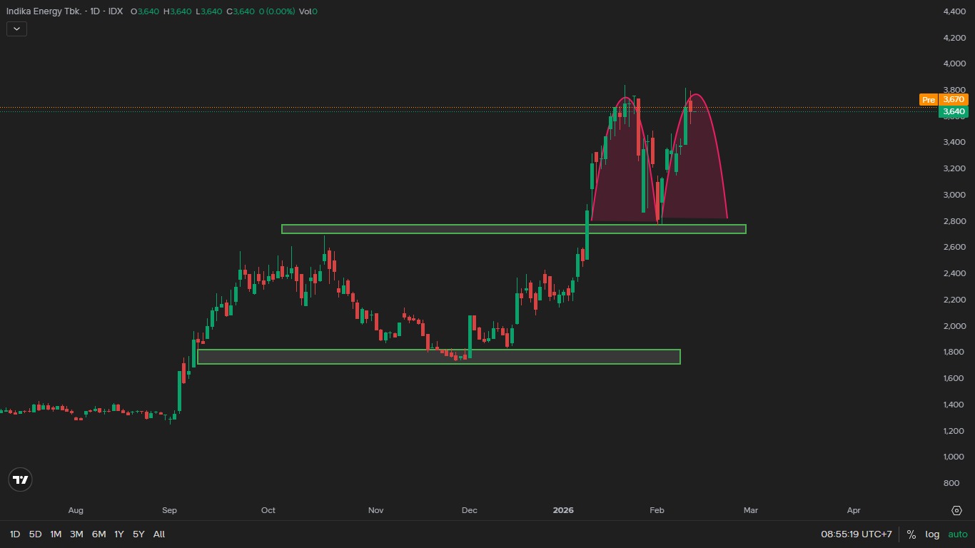 - Catatan : Saham small cap dengan volatilitas tinggi. Harga bergerak di area konsolidasi bawah setelah tekanan turun. Struktur belum membentuk uptrend sehat dan rawan false rebound, sehingga swing bersifat spekulatif dan wajib disiplin risk.