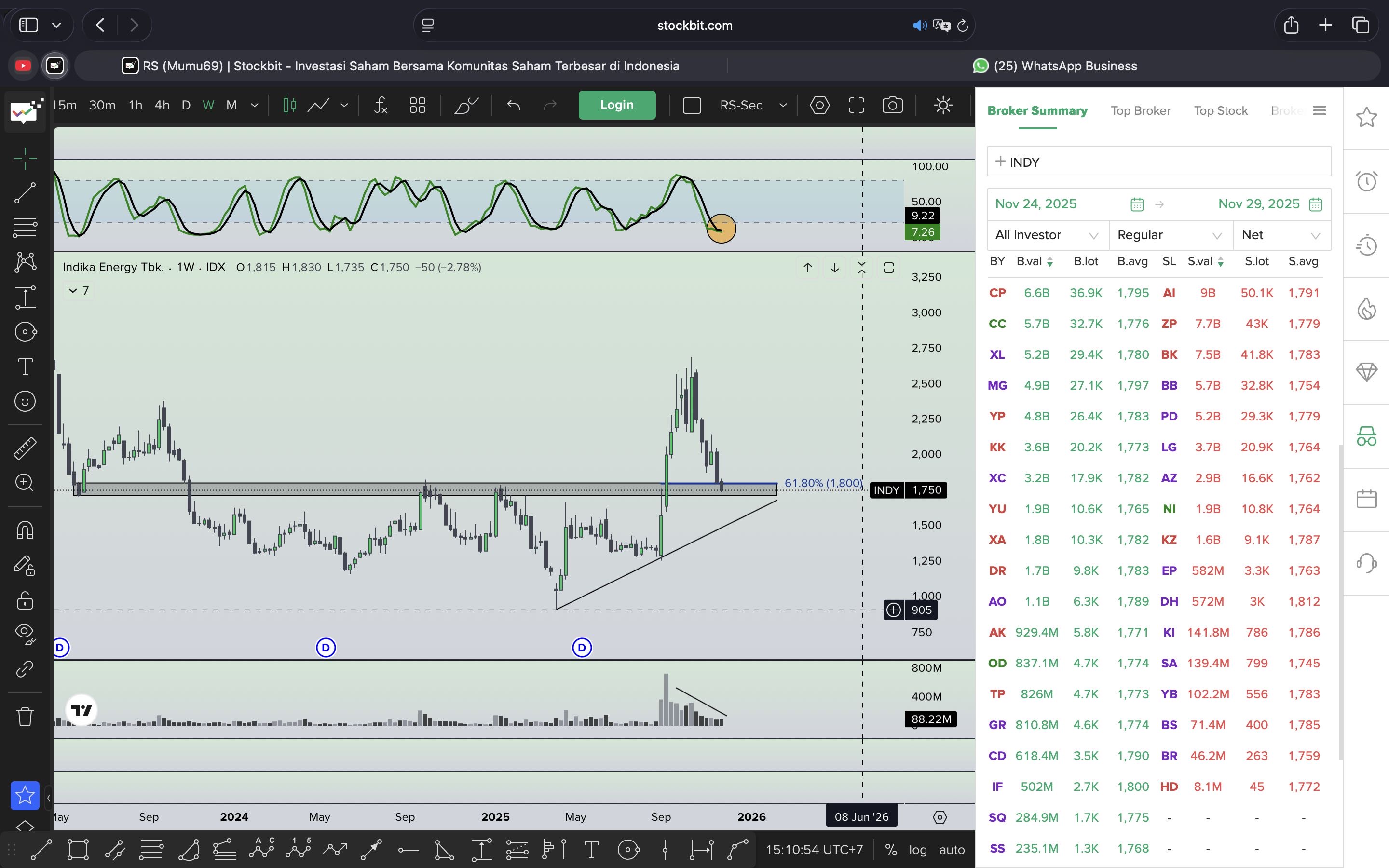 Koreksi yang terjadi saat ini ke 1800-1700 sebenarnya wajar. Saham yang Rally kencang biasanya perlu Koreksi yang lumayan dalam juga. Fyi, sejak 1 Sept - 17 Oct, ada CC yang angkat INDY, mereka punya Avg di 2143. Simplenya, sekarang ini mereka sangkut. Surprisingly minggu ini, CC keliatan mulai masuk lagi di avg 1776.