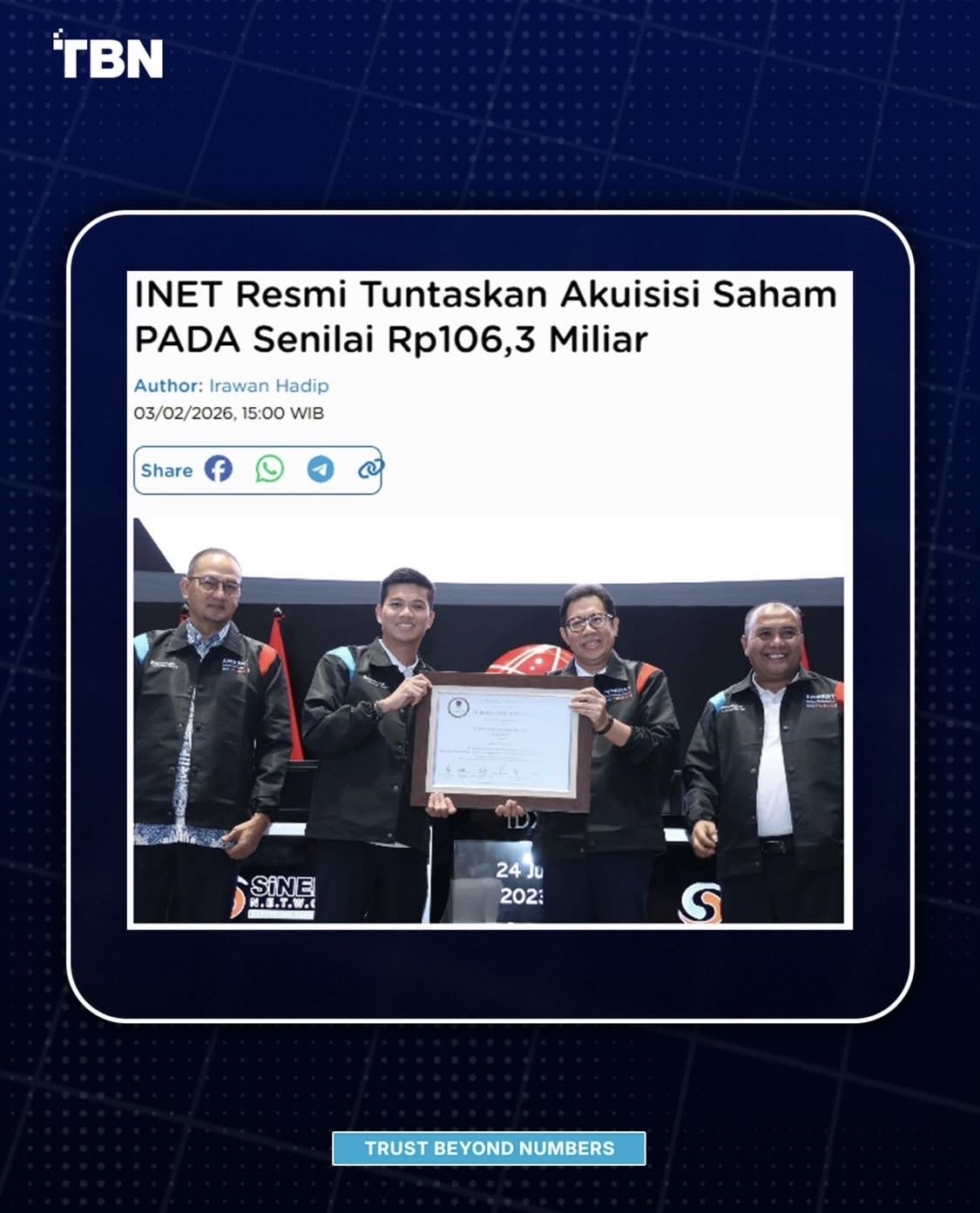 INET akan akuisisi 53,57% PADA senilai Rp106,39 miliar (±29,41% dari ekuitas INET per 30 Sep 2025).