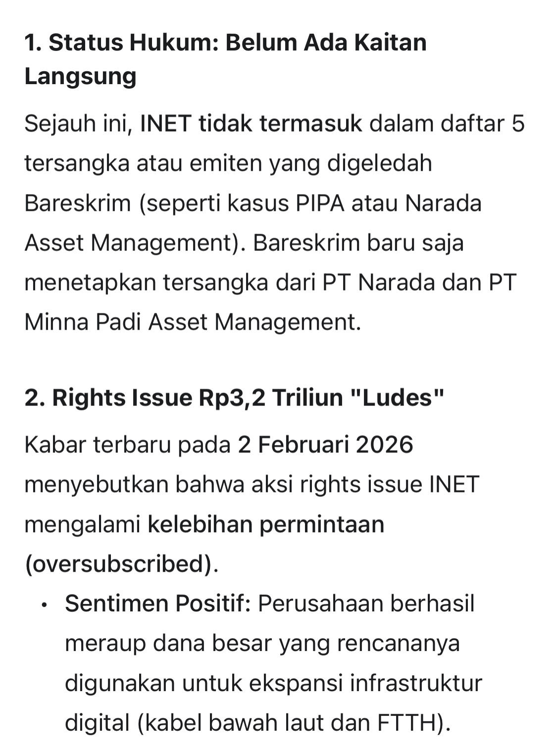 $INET Pergantian Penjamin: Untuk aksi korporasi terbaru seperti penerbitan obligasi dan sukuk senilai Rp1 triliun pada Januari-Februari 2026, INET telah beralih menggunakan KB Valbury Sekuritas dan RHB Sekuritas sebagai penjamin emisi, bukan lagi AH.