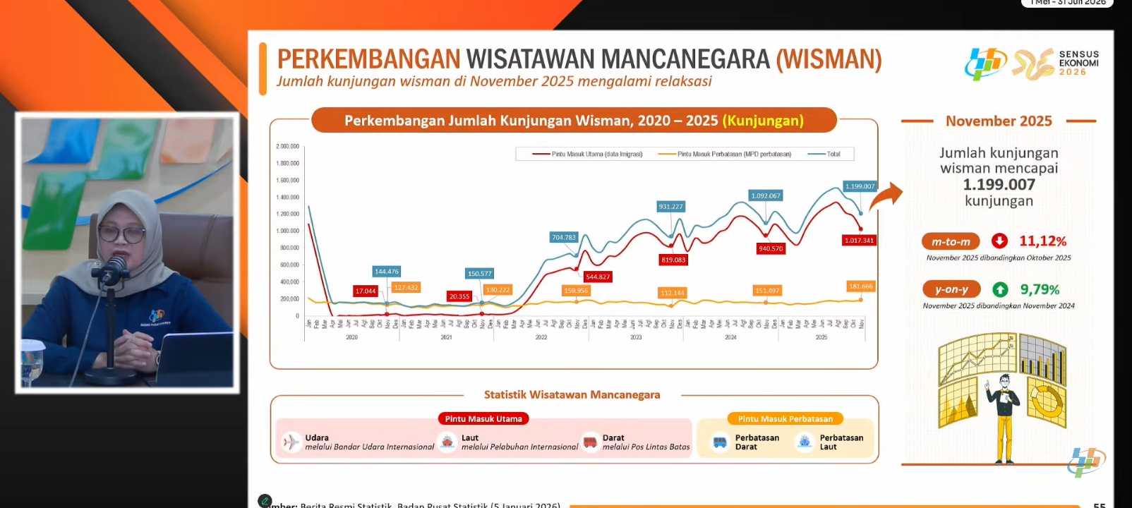 ➖ Kunjungan wisatawan mancanegara (wisman) ke Indonesia, dari luar ke dalam negeri.