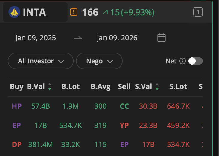 $INTA secara history tgl 30 desember 2025 memang ga keliatan ada HP di pasar nego, tapi kalau ditarik dengan frame 1 tahun maka tahu sendiri lah HP posisinya di mana.
