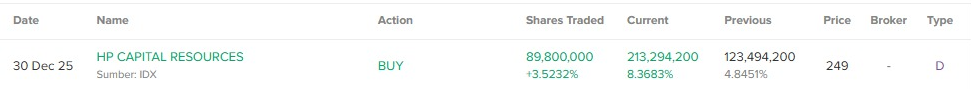 Pemegang saham Intraco Penta ($INTA), HP Capital Resources, membeli 89,8 juta saham INTA dengan harga rata–rata Rp249/lembar atau senilai total Rp22,4 M pada 30 Desember 2025. Setelah transaksi ini, porsi kepemilikan HP Capital Resources di INTA naik dari ~4,85% menjadi ~8,37%.