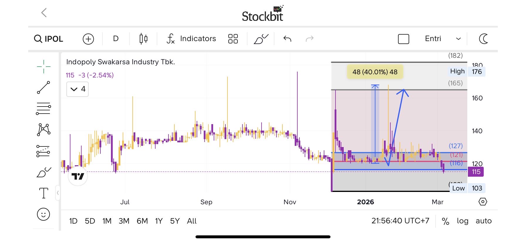 - Catatan : Saham small cap dengan volatilitas tinggi. Harga bergerak konsolidasi setelah tekanan turun. Struktur belum membentuk uptrend sehat dan rawan false breakout, sehingga swing bersifat spekulatif dan wajib disiplin risk.