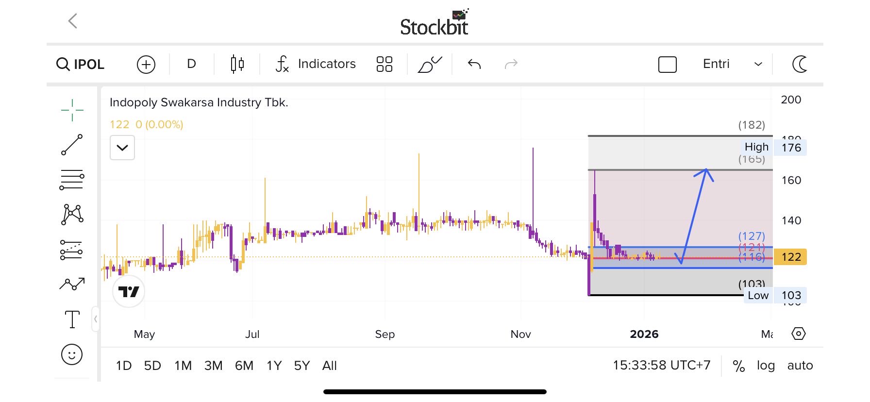 Daily close < 114 → CUT LOSS tanpa ragu (Level ini adalah batas toleransi terendah; jika ditembus, IPOL berisiko masuk ke fase downtrend baru menuju level di bawah 100).