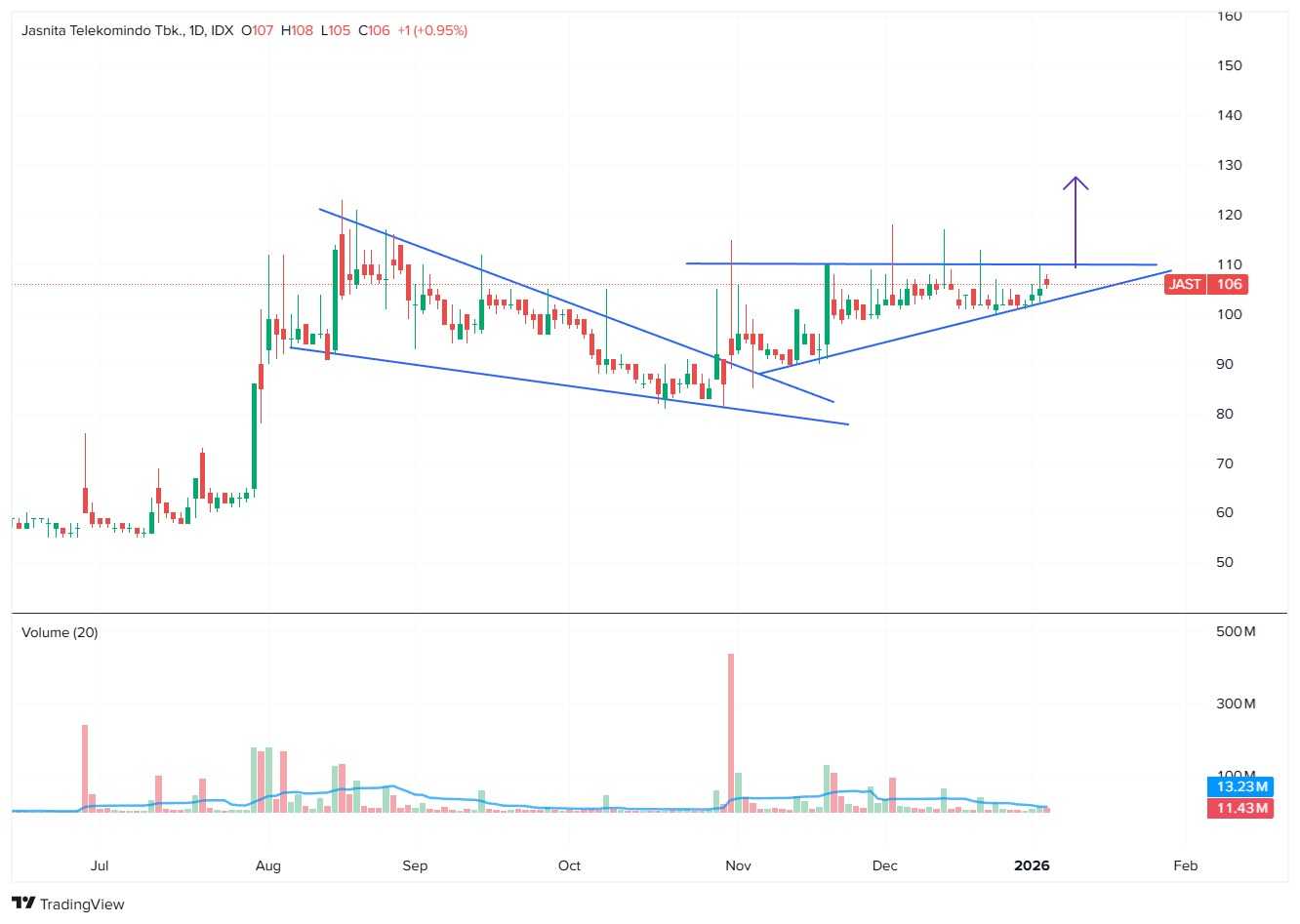- Sudah punya posisi: Hold, pertimbangkan Stop Loss di bawah 102 (di bawah MA 20).