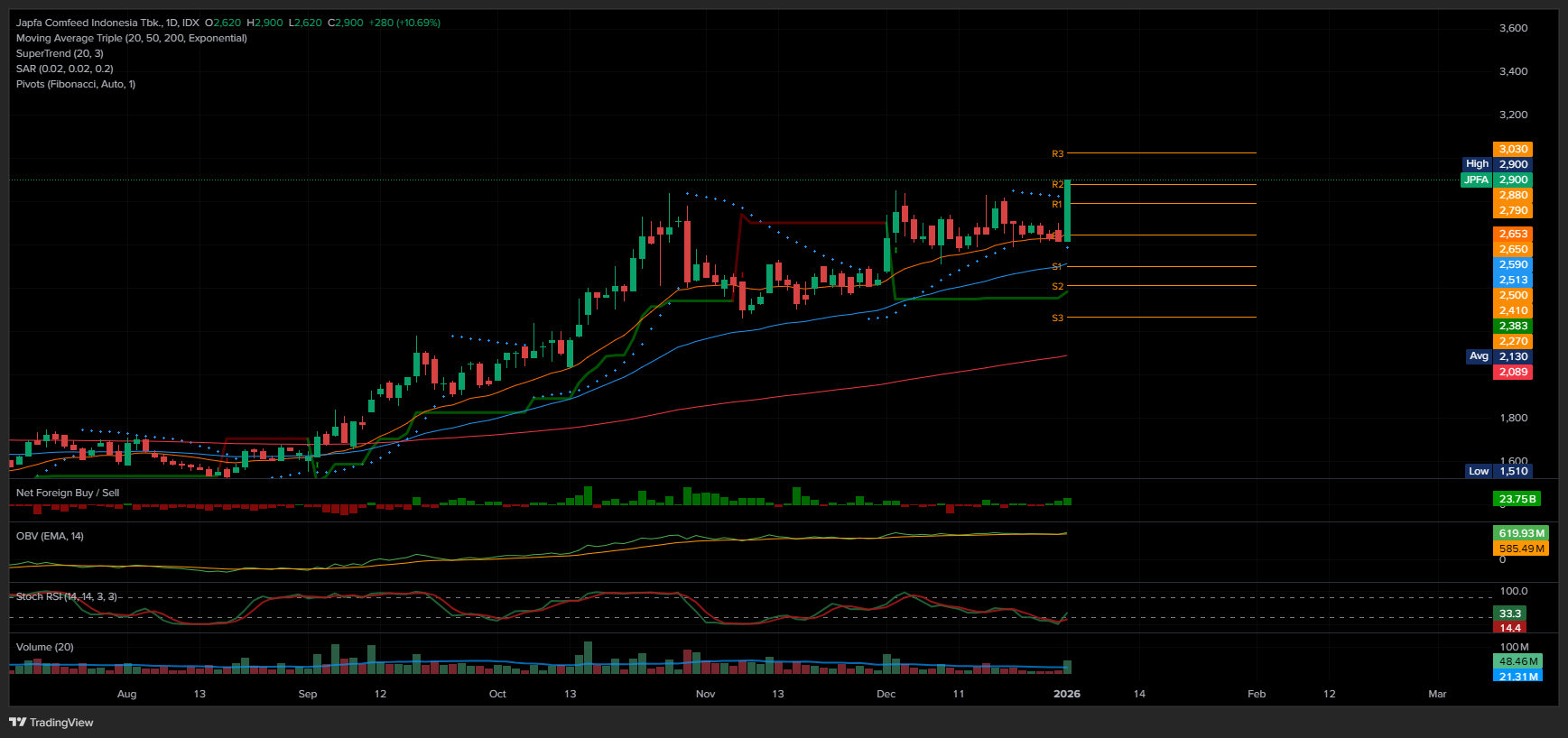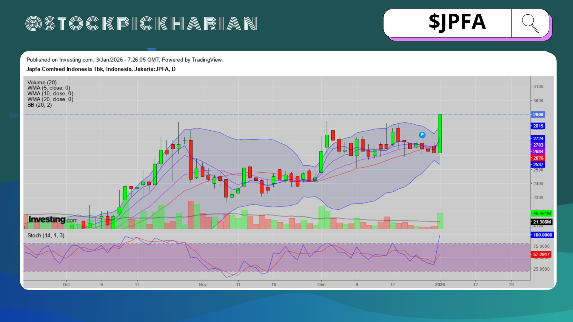 JPFA menarik untuk **swing rebound spekulatif** selama bertahan di atas support kunci 380.