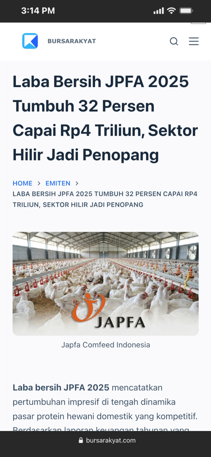EmitenNews.com - PT Japfa Comfeed Indonesia Tbk. (JPFA) emiten poultry menutup tahun 2025 dengan lonjakan laba bersih yang diatribusikan kepada pemilik entitas induk sebesar 32,89 persen year on year menjadi Rp4 triliun sepanjang 2025, dibandingkan Rp3,01 triliun pada 2024.