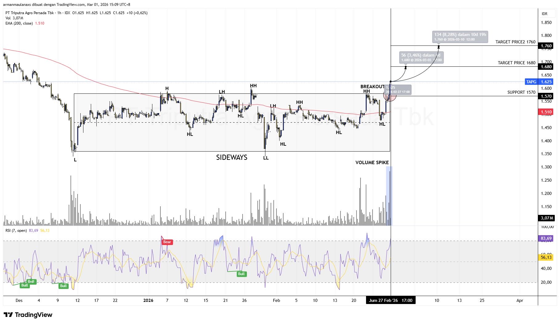 Harga saat ini di 1.625 setelah breakout dari area sideways 1.570–1.600 disertai lonjakan volume (volume spike) yang mengonfirmasi kekuatan buyer, selama harga bertahan di atas support 1.570 peluang kenaikan menuju 1.680 hingga 1.760 (±3–8%) masih terbuka. Posisi sudah kembali di atas EMA200 (1.510) menandakan pergeseran tren ke bullish, sementara RSI(7) di area ~83 menunjukkan momentum sangat kuat namun rawan pullback sehat sebelum lanjut naik. Entry ideal 1.600–1.630 (buy on breakout & buy on weakness saat retest), stop loss di bawah 1.570. Setup: bullish continuation pasca breakout konsolidasi panjang.