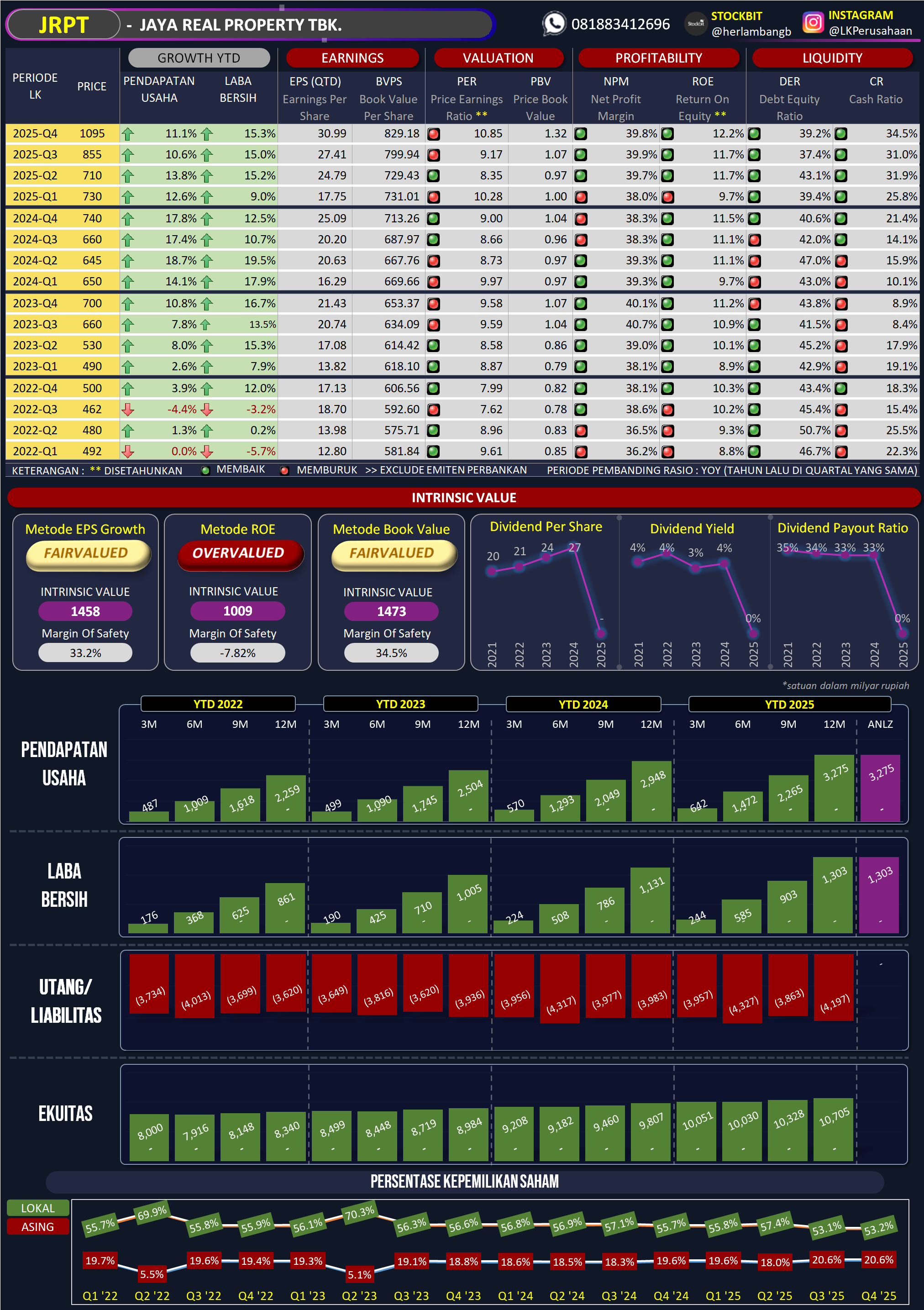 Berdasarkan laporan keuangan 2025, JRPT adalah perusahaan properti dengan fundamental "Benteng Kokoh". Mereka memiliki pertumbuhan laba yang konsisten, tumpukan kas yang besar, utang yang minim, dan loyalitas dalam membagikan dividen. Saham ini sangat cocok bagi Anda yang merupakan investor jangka menengah-panjang yang mencari stabilitas dan pertumbuhan nilai.