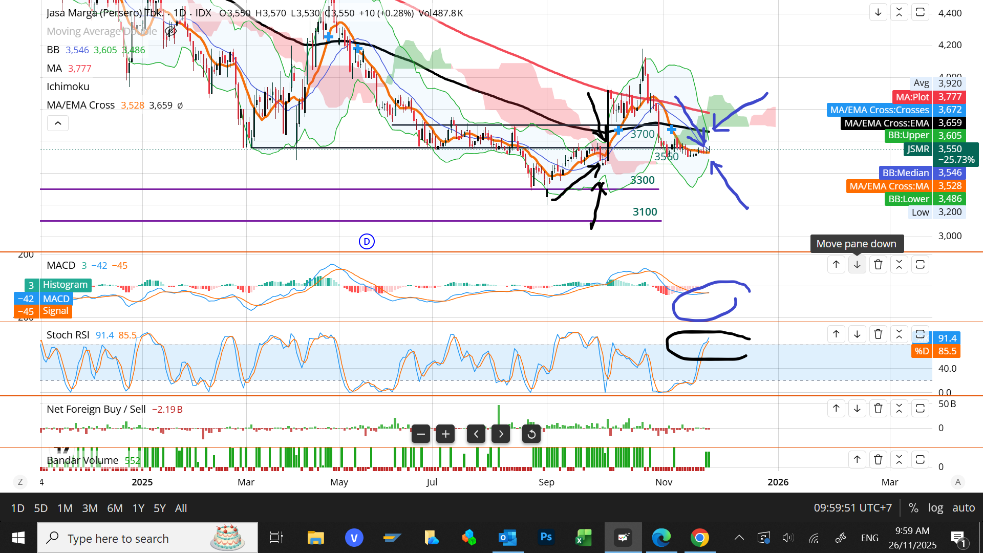 Ini ada temuan menarik ya. kalau lihat dari chart terlampir JSMR saat ini sideways, tetapi ada penyempitan BB, biasanya penyempitan ini berarti akan ada fluktuasi either itu naik atau turun.
