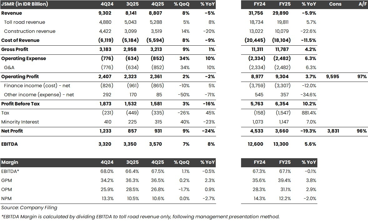 🛣️JSMR: Laba Bersih 2025 -19% YoY, Sedikit di Bawah Ekspektasi; Guidance 2026