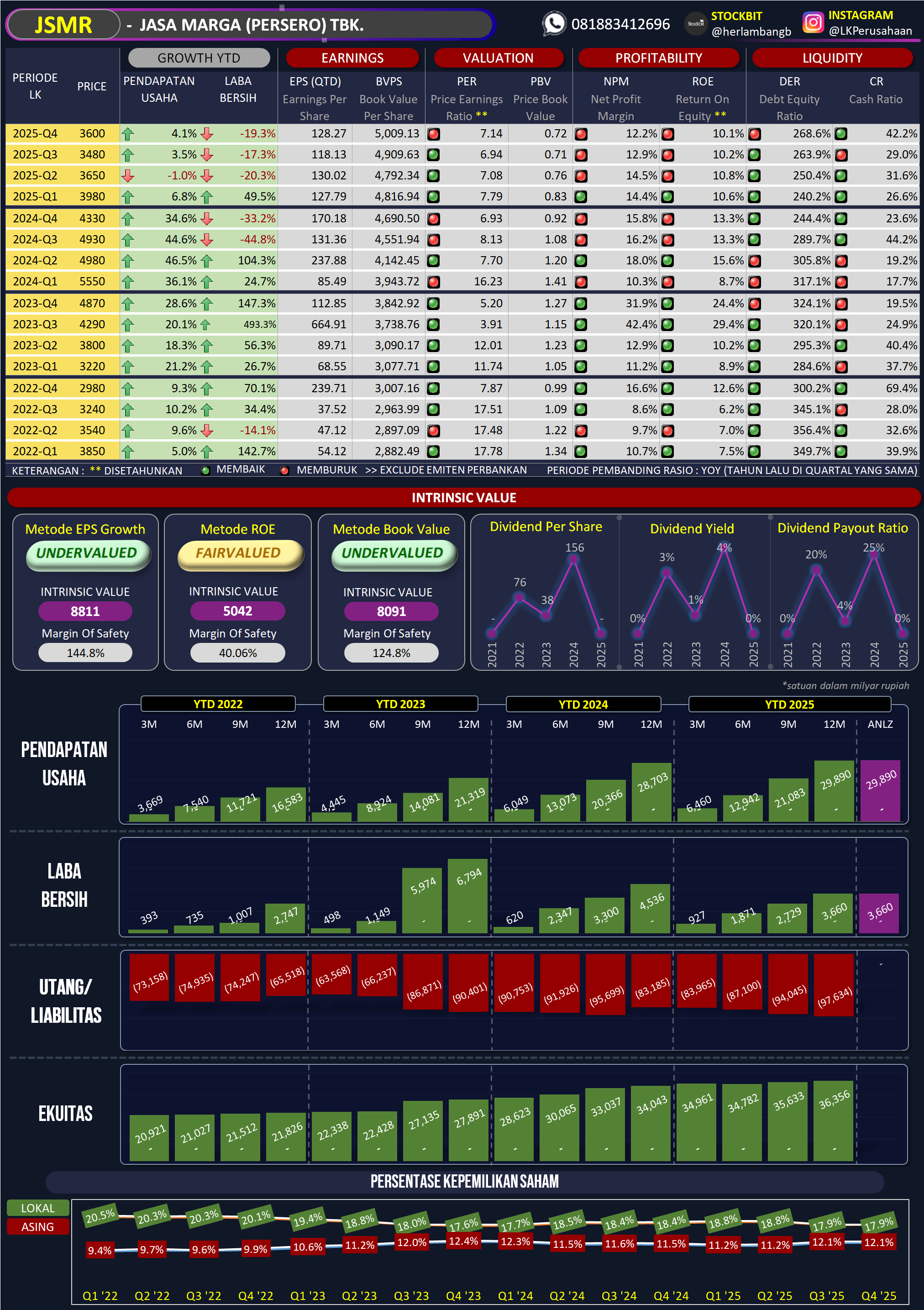 * **Aksi Valuasi:** Gunakan EPS terbaru sebesar Rp504 ini untuk menghitung *Price to Earnings Ratio* (PER) menggunakan harga saham JSMR saat ini di bursa. Jika valuasinya historisnya tergolong murah, JSMR sangat cocok dijadikan instrumen investasi jangka menengah hingga panjang (*defensive stock*).