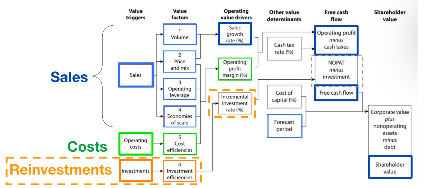 Sekarang kita menyadari bahwa metric ROIC harus menjadi perhatian utama investor. ROIC adalah dasar dari DCF. Investor, semalas-malasnya melakukan DCF, tetap harus berpikir dalam framework DCF. ROIC tidak hanya sekedar berbicara tentang return saja. Ia memaksa kita untuk mengerti tiap-tiap aspek penting dalam sebuah perusahaan. Belajar tentang 1 metric ROIC saja, akan membedah banyak hal, antara lain: