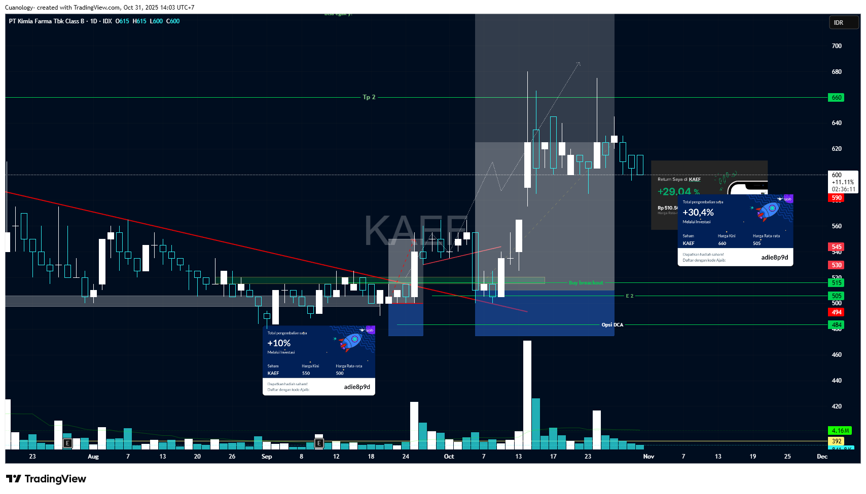 Meski begitu, ada isu positif bahwa KAEF akan menjual 38 aset tanah dan bangunan senilai Rp2,1 triliun untuk melunasi utang dan menambah modal kerja. Sentimen ini bisa membuat harga saham naik sementara ke kisaran Rp650–Rp700, tapi secara fundamental masih berisiko turun kembali ke Rp550–Rp600 jika kinerja keuangan tidak membaik.