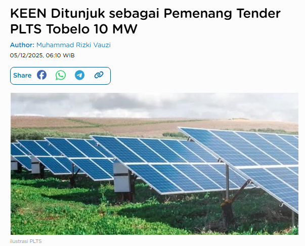 PT Kencana Energi Lestari Tbk (KEEN) ditetapkan sebagai pemenang tender proyek IPP Pembangkit Listrik Tenaga Surya (PLTS) Photovoltaic Tobelo oleh PLN. Proyek berkapasitas 10 MW dan didukung baterai 8,4 MWh ini akan dibangun di Tobelo Utara, Halmahera Utara, dan menjadi proyek PLTS pertama KEEN yang memiliki PPA dengan PLN. Manajemen menyebut proyek ini sebagai tonggak baru bagi pengembangan bisnis energi surya perusahaan.