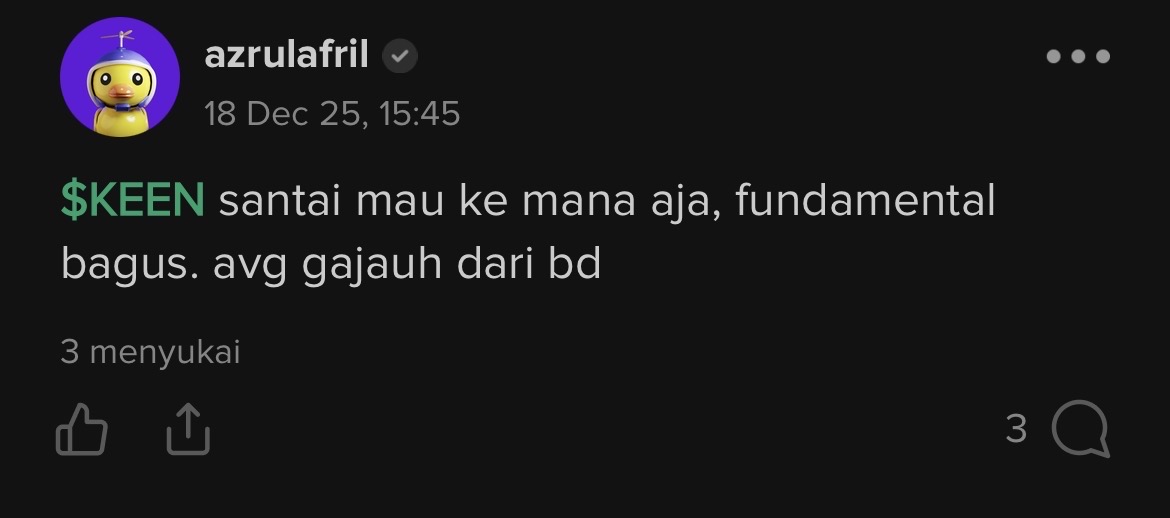 tapi yg penting..ngapain araaa bangkee $KEEN belum juga 50 jt disini adeuhh cicil² dari november..yaudah terbangin aja bapak² bandar..jgn kasih ritel mental tempe untung 🙏